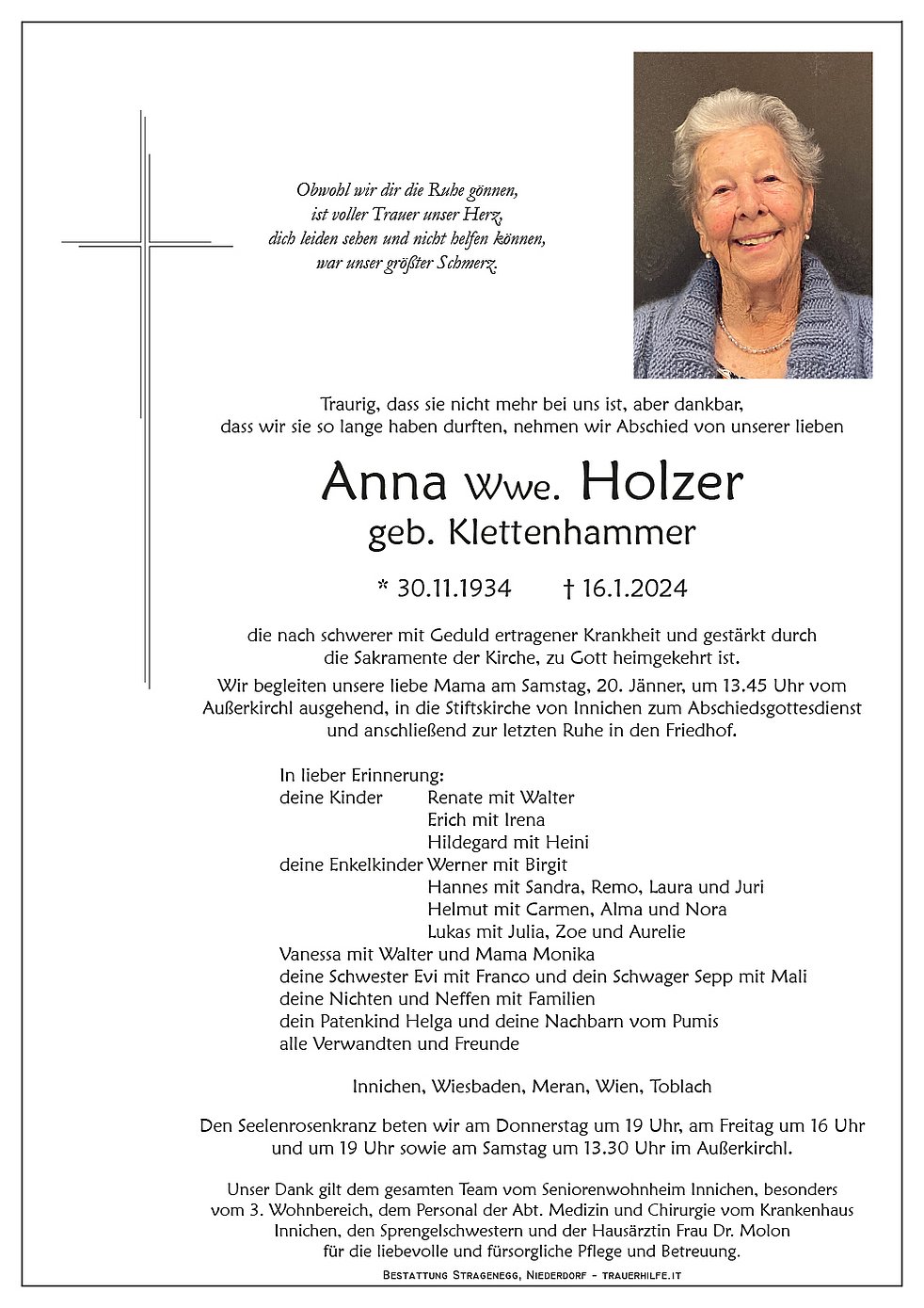 Nannele, worsch olm soffl a liabo Mensch und die beschte Freundin va meindo Mamme. VergeltsGott für die gemeinsame Zeit und die wunderschian Momente. Iatz seits es im Himml beinonnt. An stilln und innigen Gedonkn. Alex