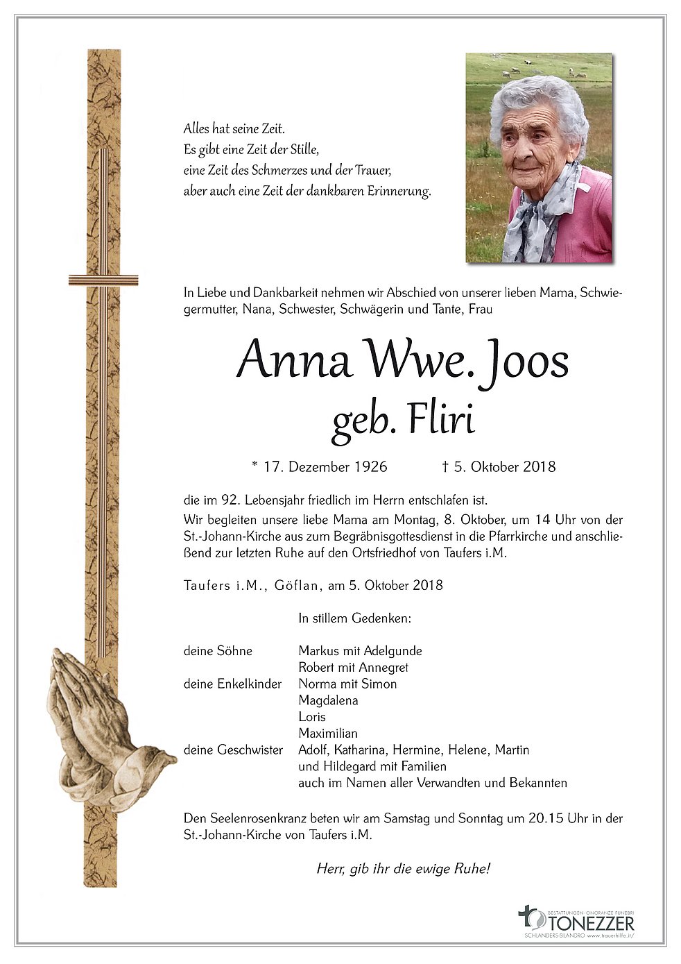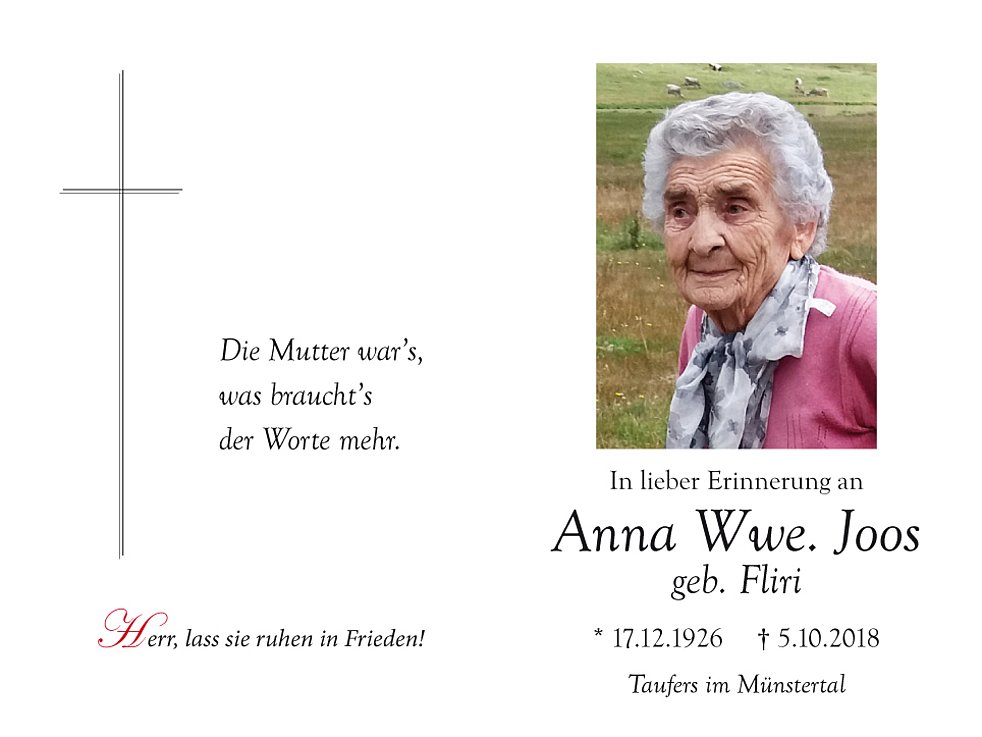 Wir begleiten unsere liebe Mama am Montag, 8. Oktober, um 14 Uhr von der St.-Johann-Kirche aus zum Begräbnisgottesdienst in die Pfarrkirche und anschließend zur letzten Ruhe auf den Ortsfriedhof von Taufers i.M.