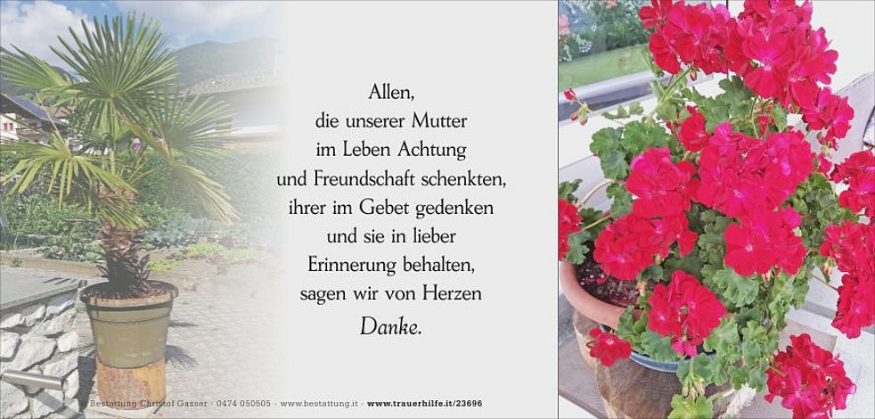 Ein herzlicher Dank gilt den Ärzten und dem gesamten Personal vom Wohn- und Pflegeheim Bruneck für die liebevolle Betreuung und Begleitung.