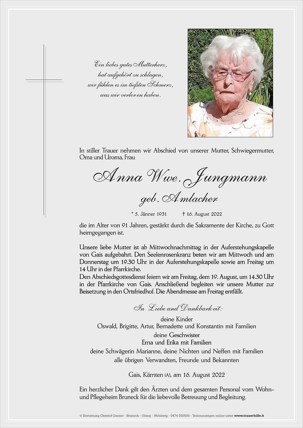 Den Abschiedsgottesdienst feiern wir am Freitag, dem 19. August, um 14.30 Uhr in der Pfarrkirche von Gais. Anschließend begleiten wir unsere Mutter zur Beisetzung in den Ortsfriedhof. Die Abendmesse am Freitag entfällt.
