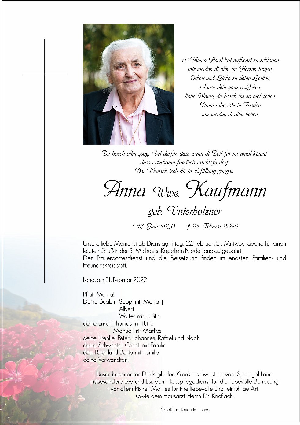 iatz darf die Mama rostn und hot geterft friedlich drhuam inschlofn, genau wia sie sich des gwunschn hot. Du hosch sou fescht auf ihr gschaug und worsch olbm für sie do. Und wos man tiaf in seinem Herzen hot, konn uan a dr Tod nit nehmen. Iatz bleibm die schianen Erinnerungen, de uan niamand nehmen konn.