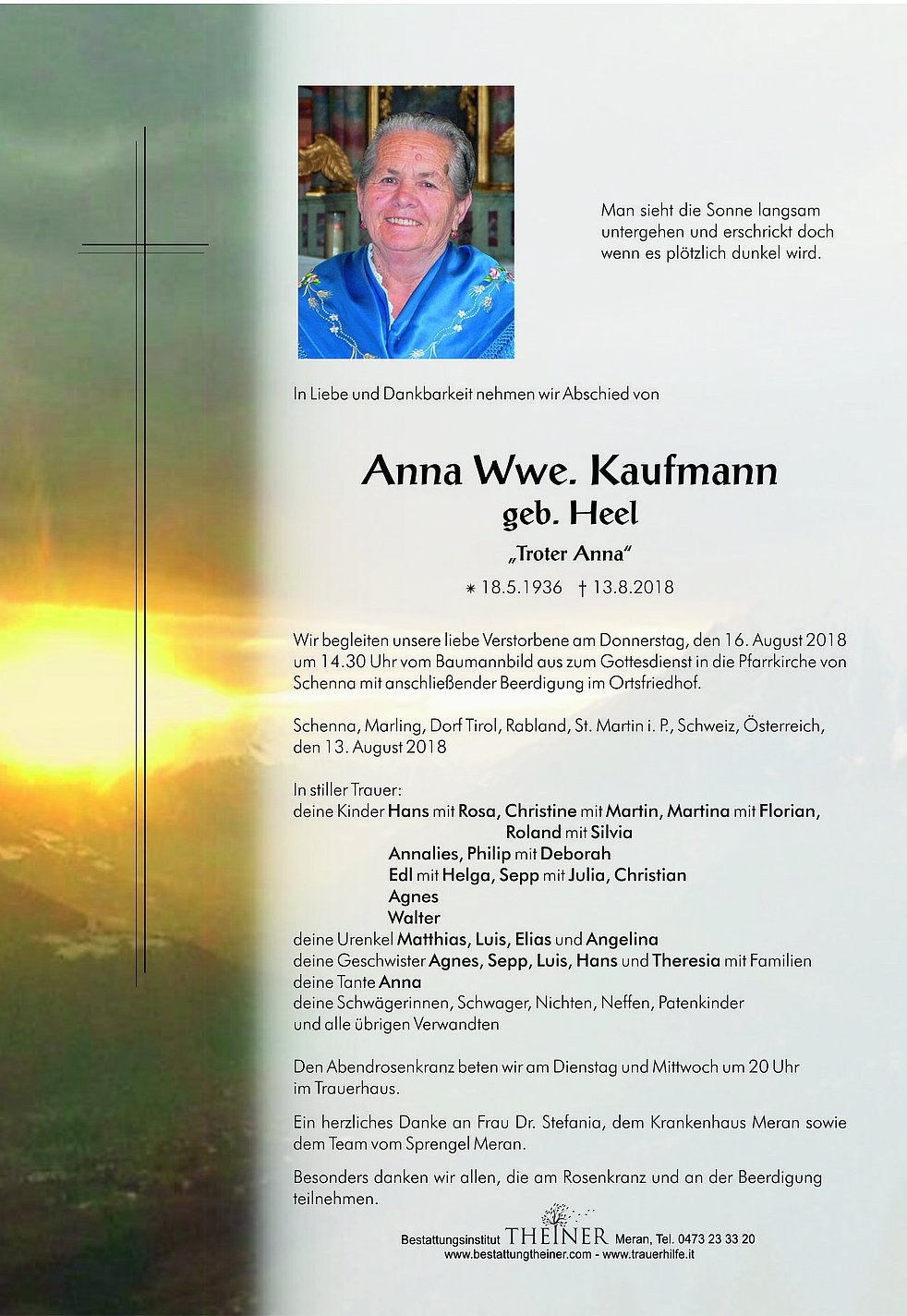 Wir begleiten unsere liebe Verstorbene am Donnerstag, den 16. August 2018 um 14.30 Uhr vom Baumannbild aus zum Gottesdienst in die Pfarrkirche von Schenna mit anschließender Beerdigung im Ortsfriedhof.