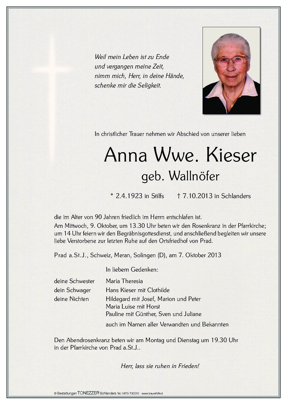 Am Mittwoch, 9. Oktober, um 13.30 Uhr beten wir den Rosenkranz in der Pfarrkirche; um 14 Uhr feiern wir den Begräbnisgottesdienst, und anschließend begleiten wir unsere liebe Verstorbene zur letzten Ruhe auf den Ortsfriedhof von Prad.