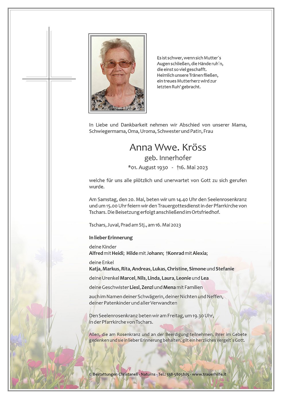 Am Samstag, den 20. Mai, beten wir um 14.40 Uhr den Seelenrosenkranz und um 15.00 Uhr feiern wir den Trauergottesdienst in der Pfarrkirche von Tschars. Die Beisetzung erfolgt anschließend im Ortsfriedhof.