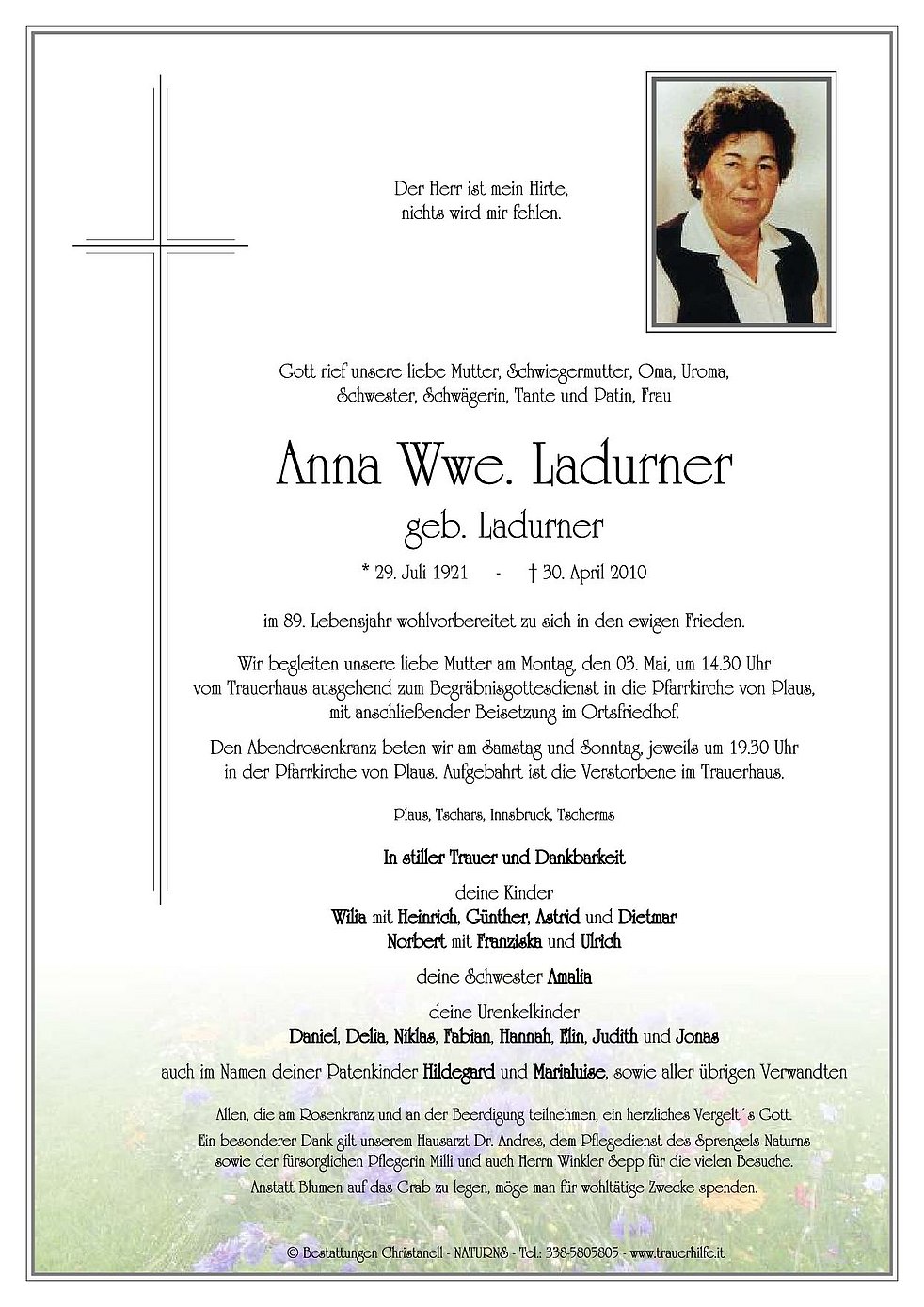 Wir begleiten unsere liebe Mutter am Montag, den 03. Mai, um 14.30 Uhr vom Trauerhaus ausgehend zum Begräbnisgottesdienst in die Pfarrkirche von Plaus, mit anschließender Beisetzung im Ortsfriedhof.
