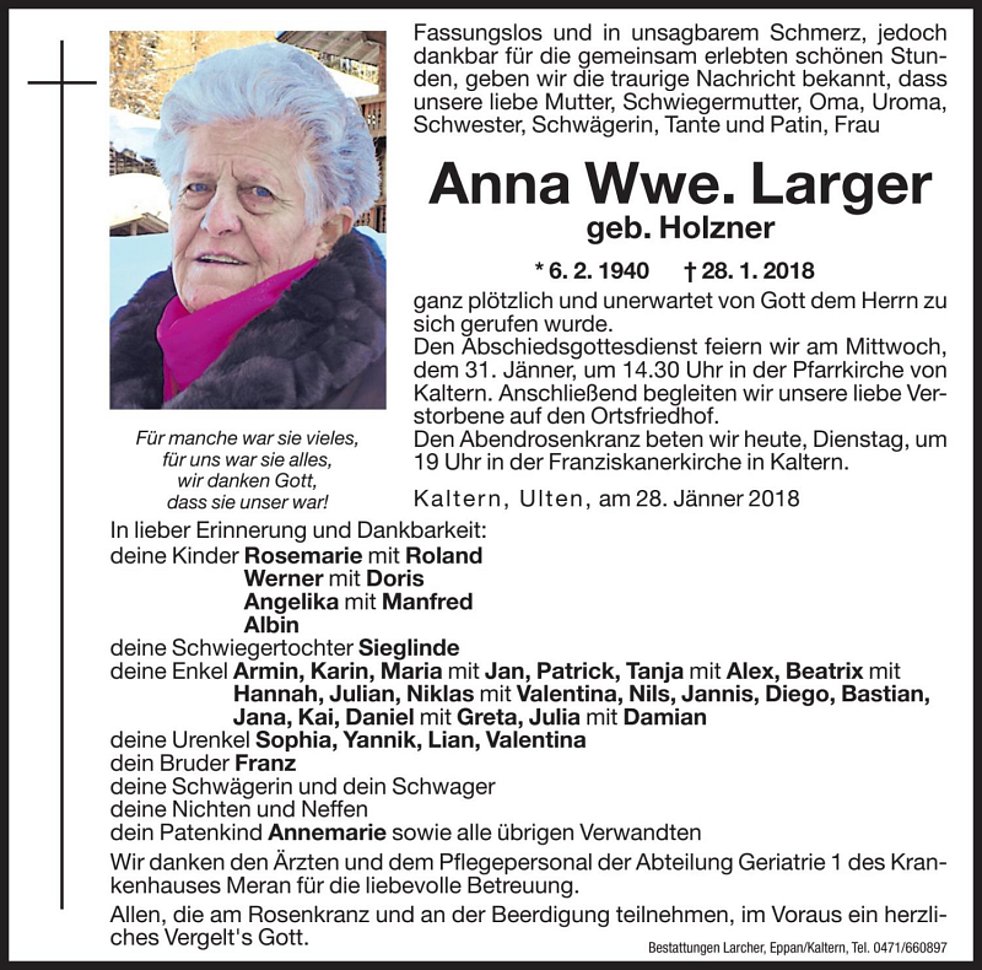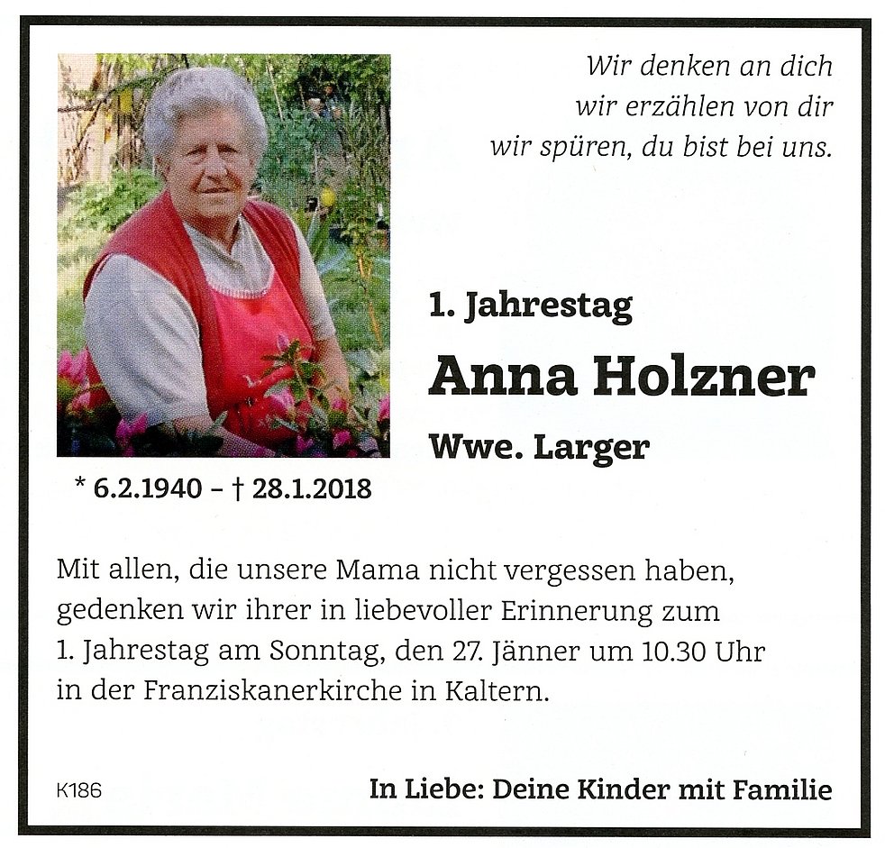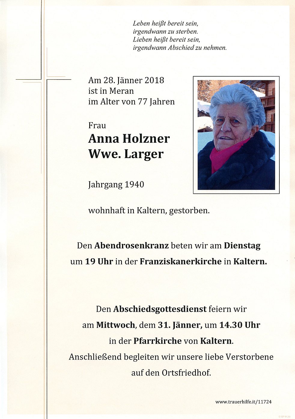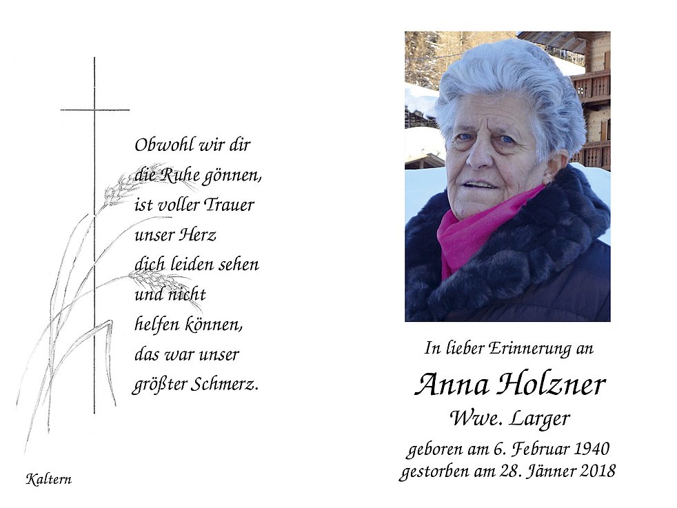 Den Abschiedsgottesdienst feiern wir am Mittwoch, dem 31. Jänner um 14.30 Uhr in der Pfarrkirche von Kaltern. Anschließend begleiten wir unsere liebe Verstorbene auf den Ortsfriedhof.