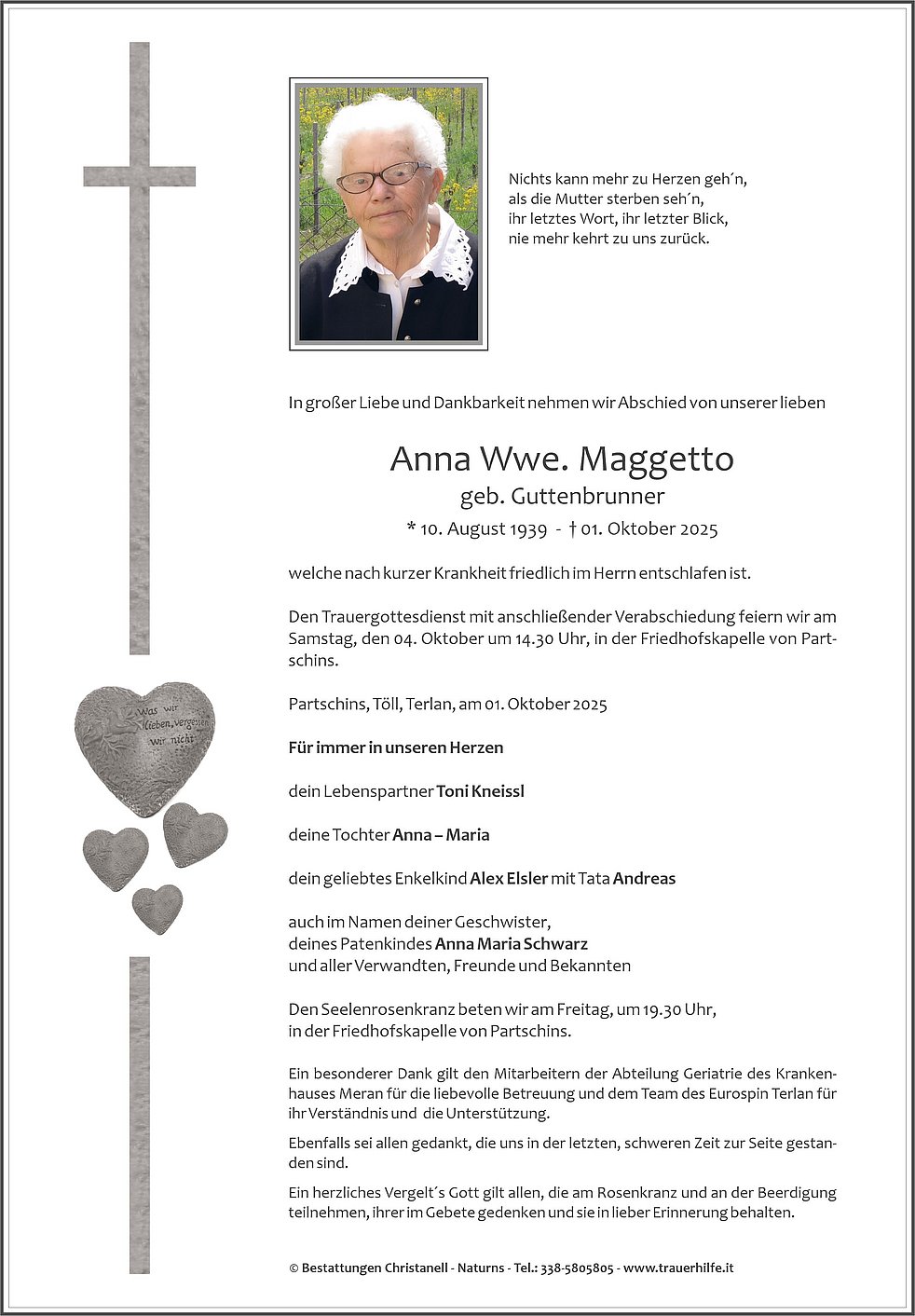 Den Trauergottesdienst mit anschließender Verabschiedung feiern wir am Samstag, den 04. Oktober um 14.30 Uhr, in der Friedhofskapelle von Partschins.
