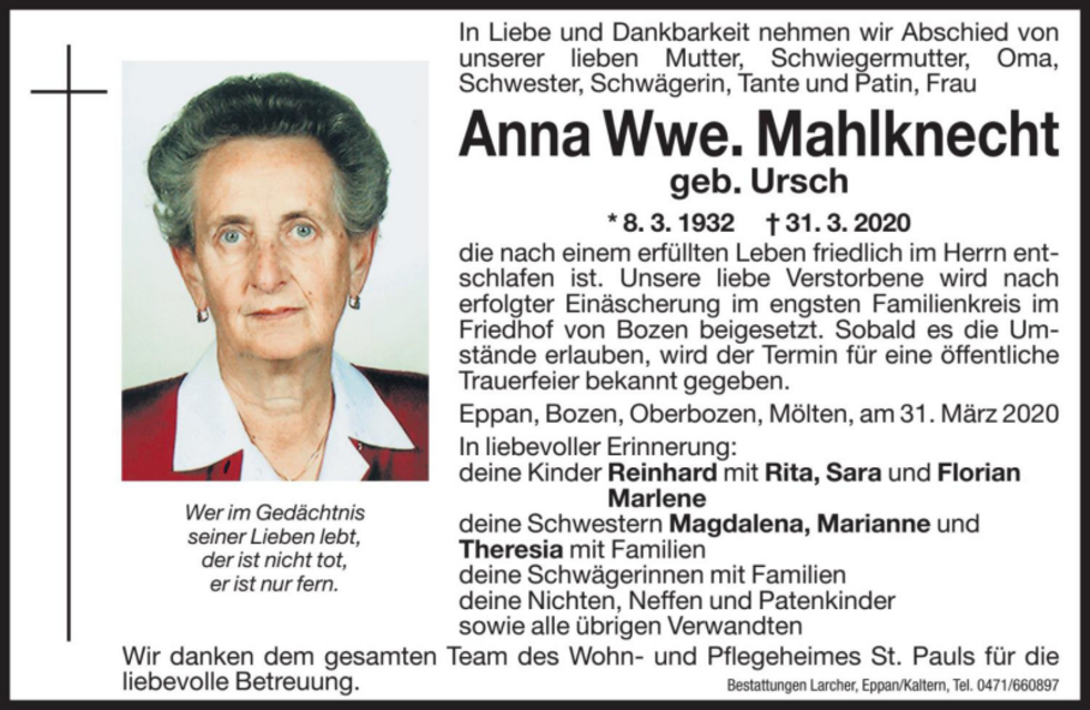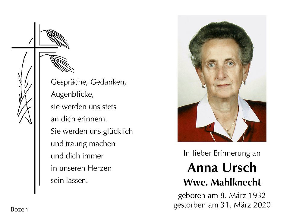Unsere liebe Verstorbene wird nach erfolgter Einäscherung im engsten Familienkreis im Friedhof von Bozen beigesetzt.