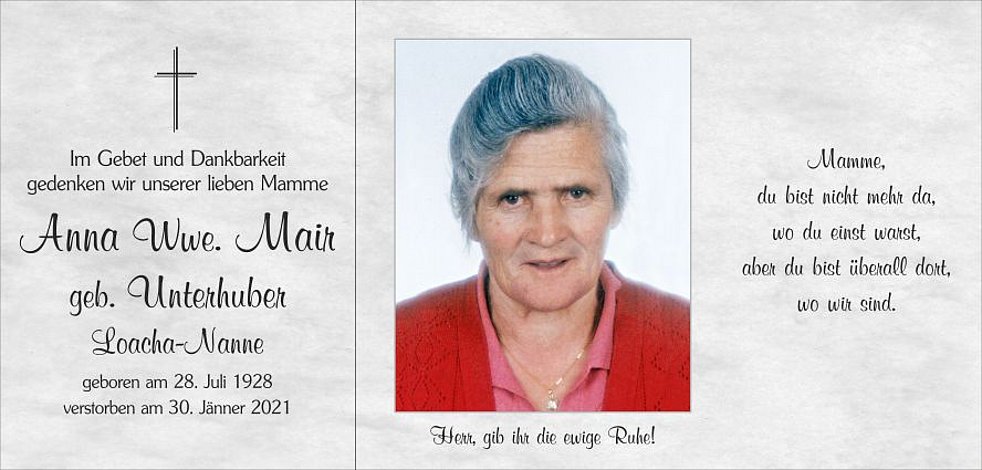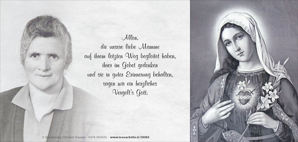Den Trauergottesdienst für unsere liebe Mamme feiern wir am Mittwoch, dem 3. Februar, um 14.30 Uhr in der Pfarrkirche von Terenten.