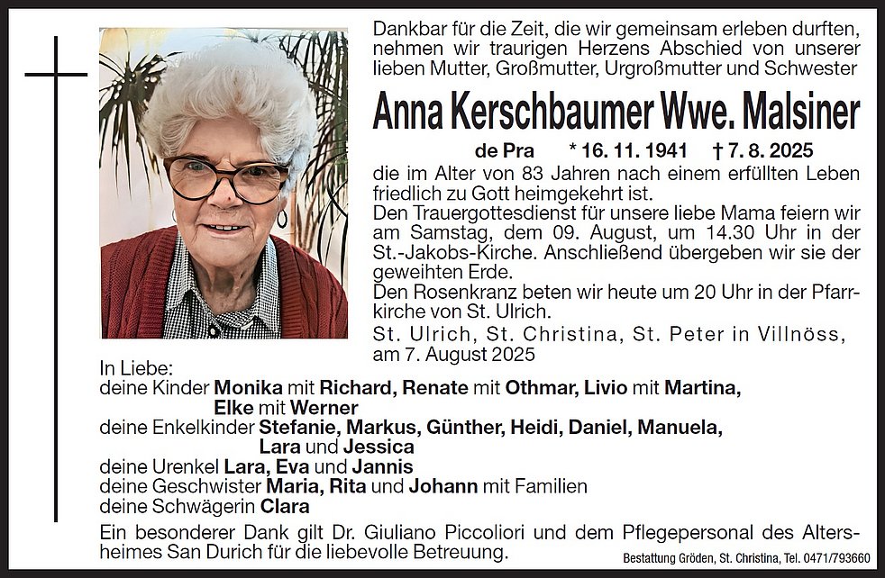 Dankbar für die Zeit, die wir gemeinsam erleben durften, nehmen wir traurigen Herzens Abschied von unserer lieben Mutter, Großmutter, Urgroßmutter und Schwester