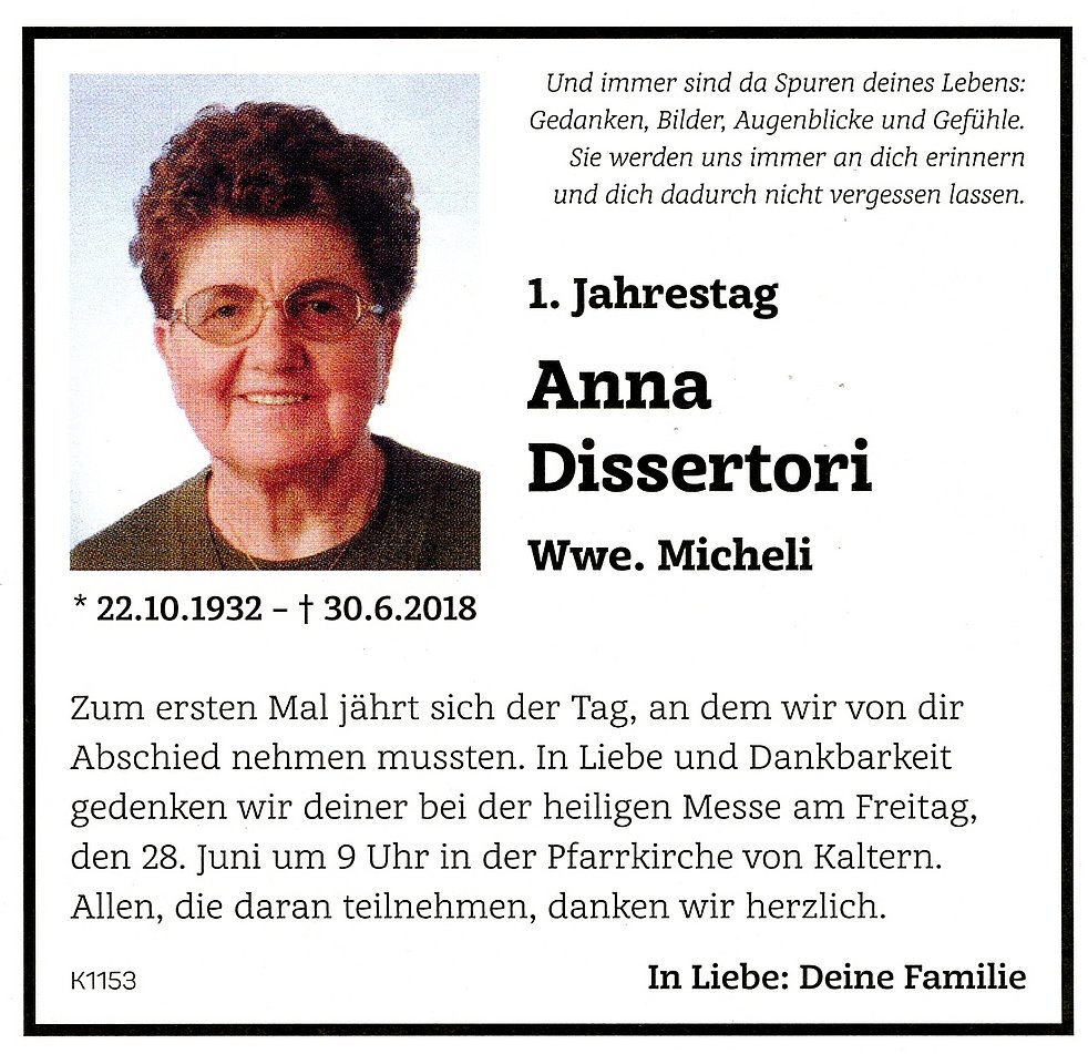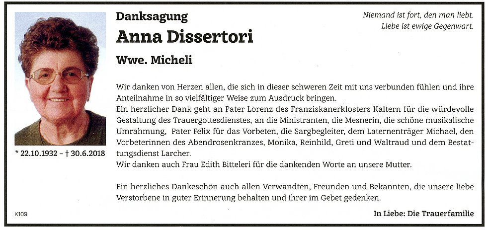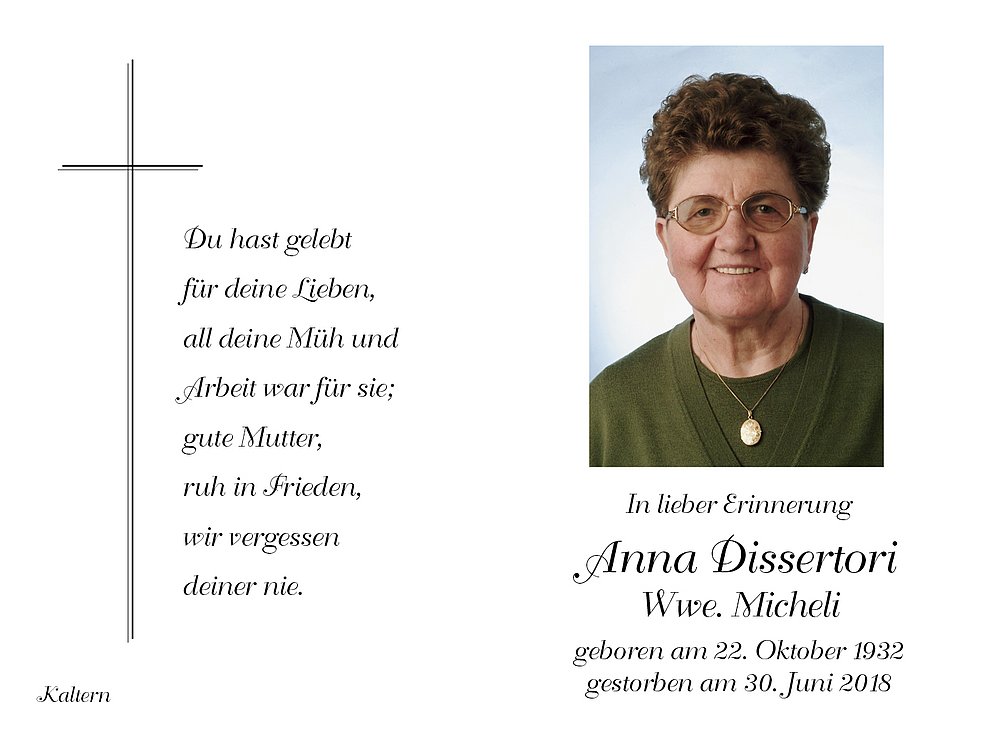 Den Abschiedsgottesdienst feiern wir am Dienstag, dem 3. Juli um 17 Uhr in der Pfarrkirche von Kaltern. Anschließend begleiten wir unsere liebe Anna auf den Ortsfriedhof.