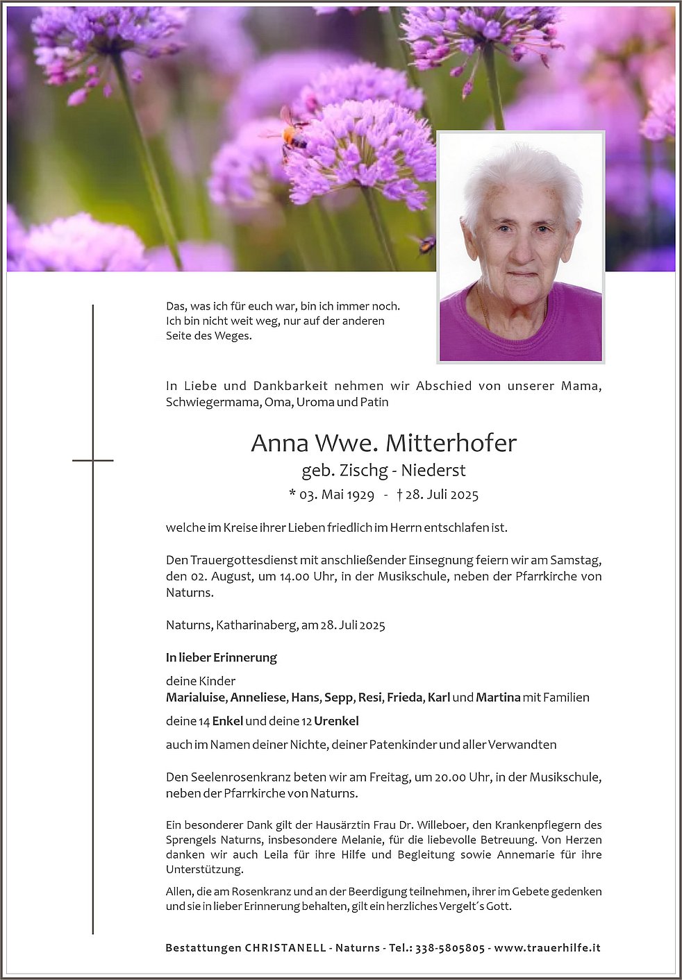 Den Trauergottesdienst mit anschließender Einsegnung feiern wir am Samstag, den 02. August, um 14.00 Uhr, in der Musikschule, neben der Pfarrkirche von Naturns.