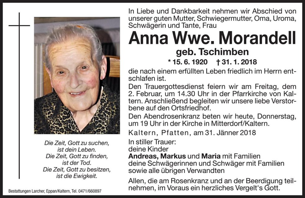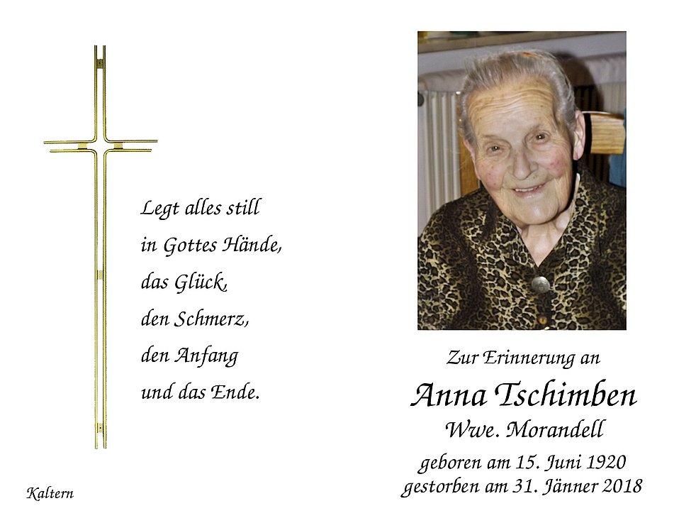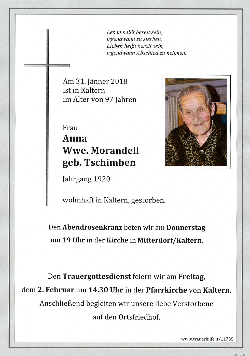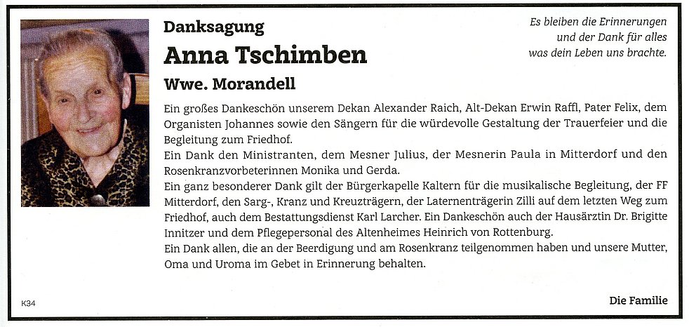 Den Trauergottesdienst feiern wir am Freitag, dem 2. Februar um 14.30 Uhr in der Pfarrkirche von Kaltern. Anschließend begleiten wir unsere liebe Verstorbene auf den Ortsfriedhof.