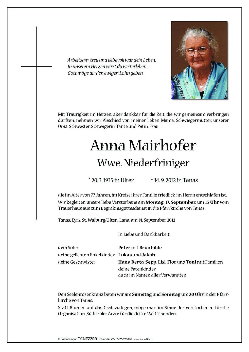 Wir begleiten unsere liebe Verstorbene am Montag, 17. September, um 15 Uhr vom Trauerhaus aus zum Begräbnisgottesdienst in die Pfarrkirche von Tanas.