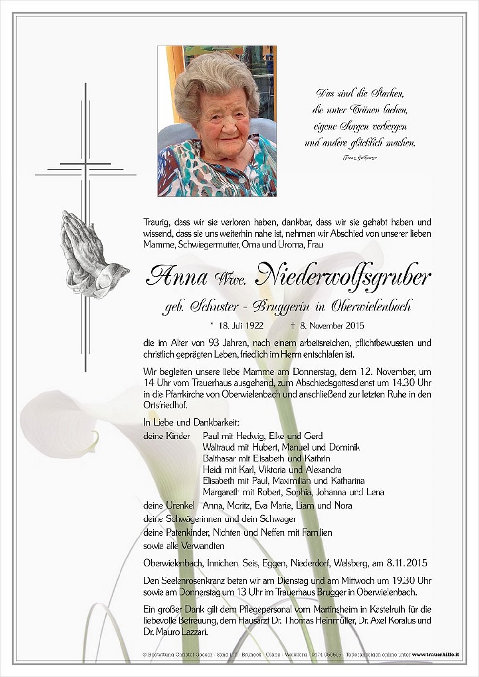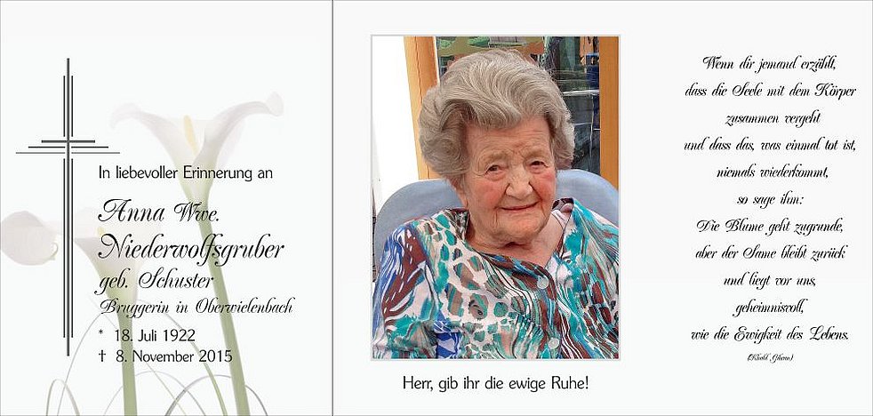 die im Alter von 93 Jahren, nach einem arbeitsreichen, pflichtbewussten und christlich geprägten Leben, friedlich im Herrn entschlafen ist.