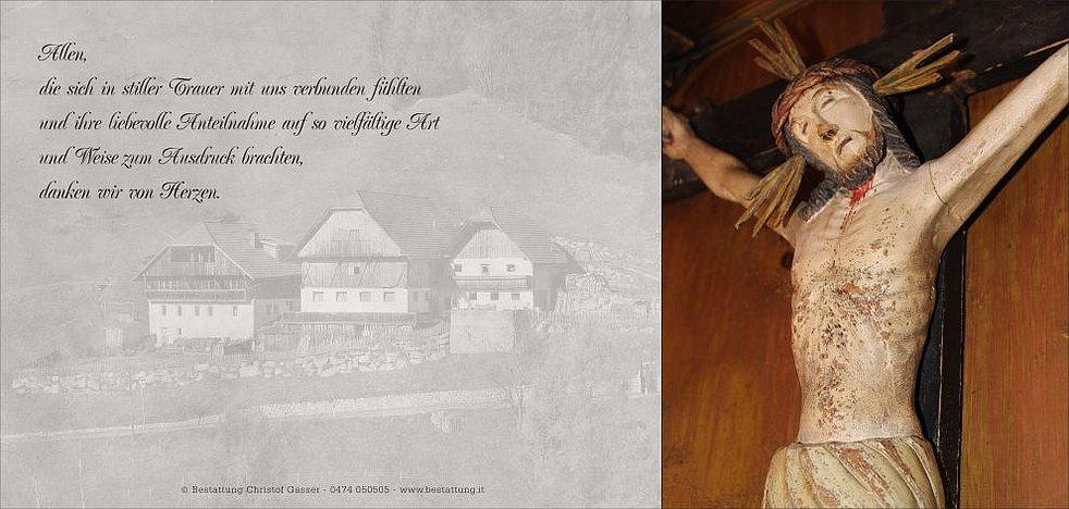 Ein großer Dank gilt dem Pflegepersonal vom Martinsheim in Kastelruth für die liebevolle Betreuung, dem Hausarzt Dr. Thomas Heinmüller, Dr. Axel Koralus und Dr. Mauro Lazzari.