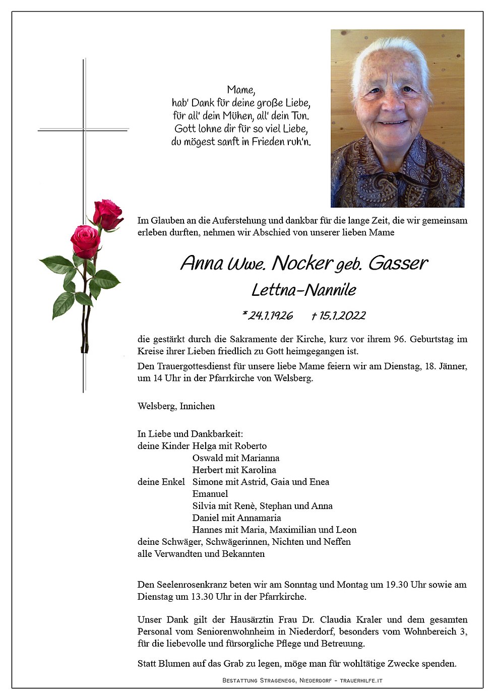 Den Trauergottesdienst für unsere liebe Mame feiern wir am Dienstag, 18. Jänner, um 14 Uhr in der Pfarrkirche von Welsberg.