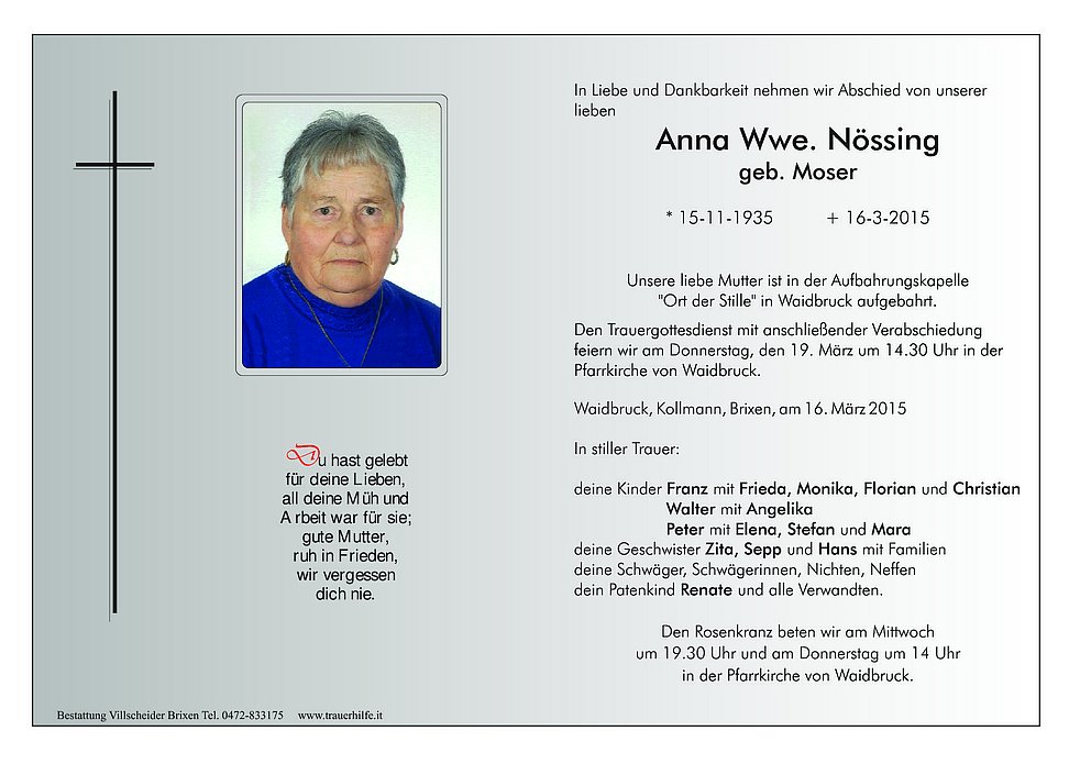 Den Trauergottesdienst mit anschließender Verabschiedung feiern wir am Donnerstag, den 19. März um 14.30 Uhr in der Pfarrkirche von Waidbruck.