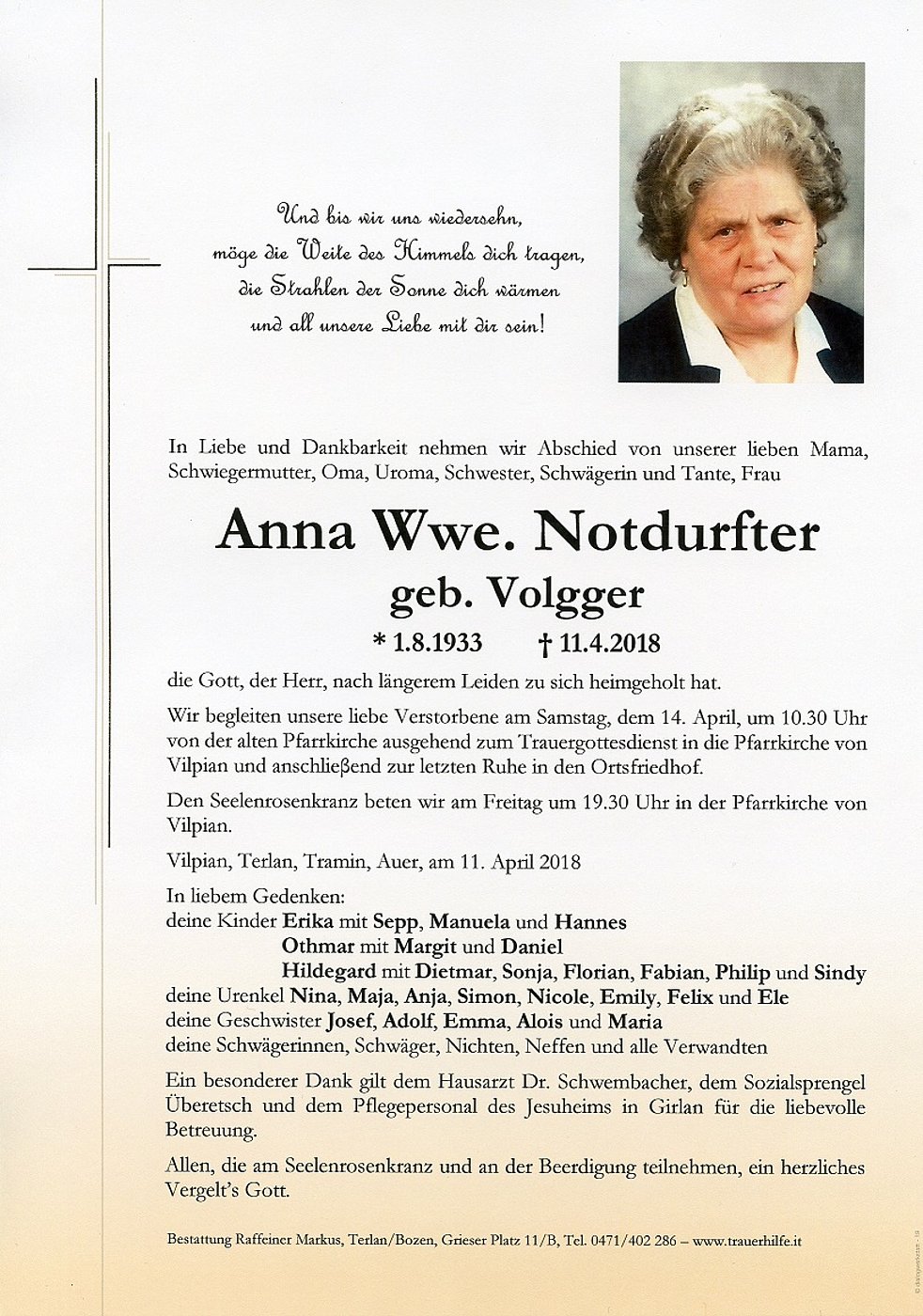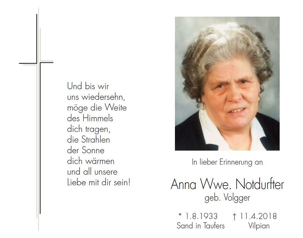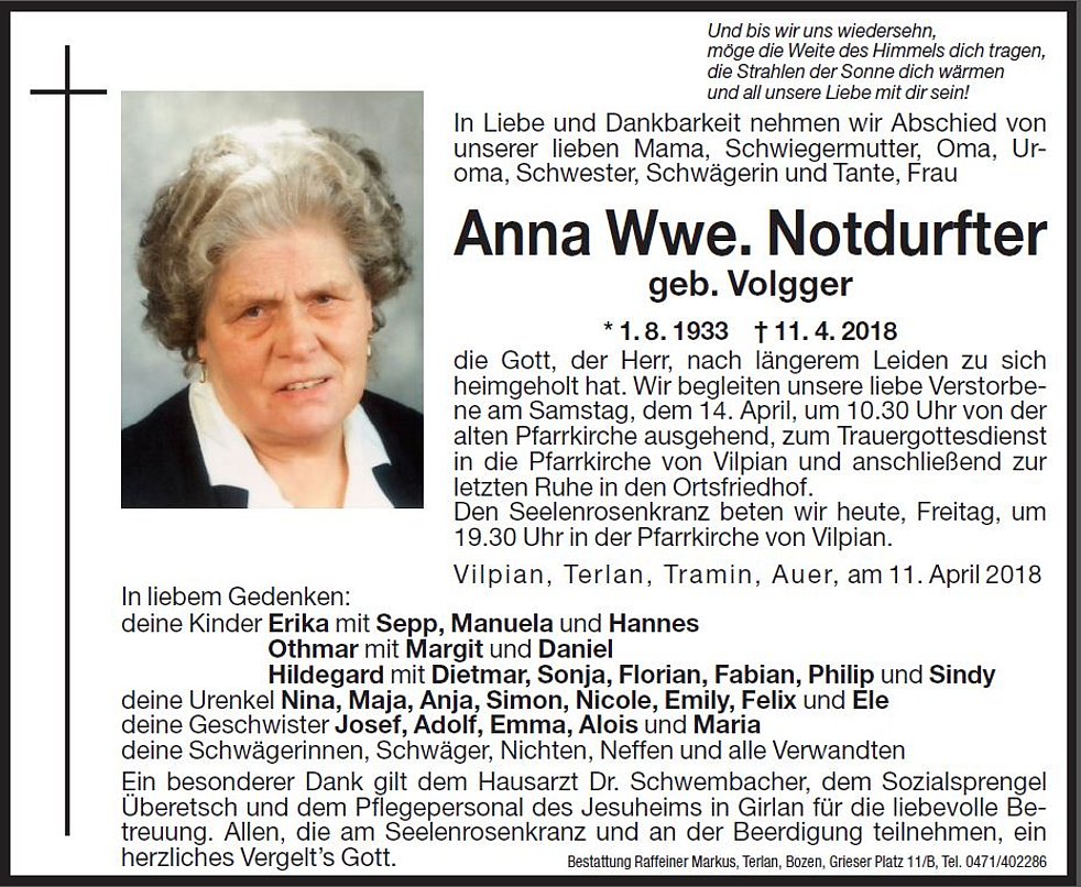 Wir begleiten unsere liebe Verstorbene am Samstag, dem 14. April, um 10.30 Uhr von der alten Pfarrkirche ausgehend zum Trauergottesdienst in die Pfarrkirche von Vilpian und anschlieβend zur letzten Ruhe in den Ortsfriedhof.