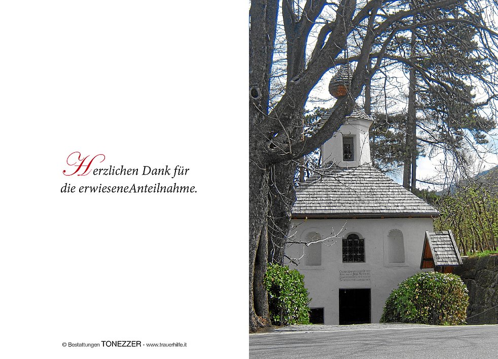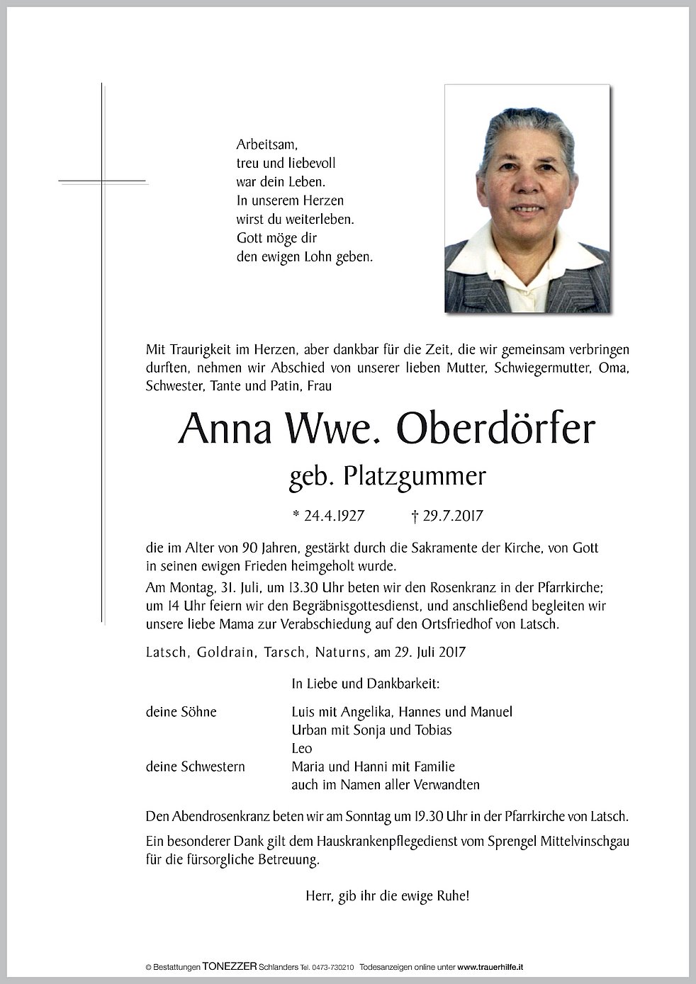 Am Montag, 31. Juli, um 13.30 Uhr beten wir den Rosenkranz in der Pfarrkirche; um 14 Uhr feiern wir den Begräbnisgottesdienst, und anschließend begleiten wir unsere liebe Mama zur Verabschiedung auf den Ortsfriedhof von Latsch.
