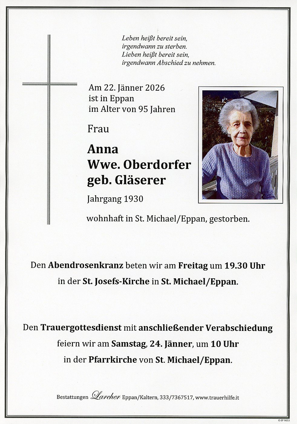 Den Trauergottesdienst mit anschließender Verabschiedung feiern wir am Samstag, dem 24. Jänner, um 10 Uhr in der Pfarrkirche von St. Michael/Eppan.