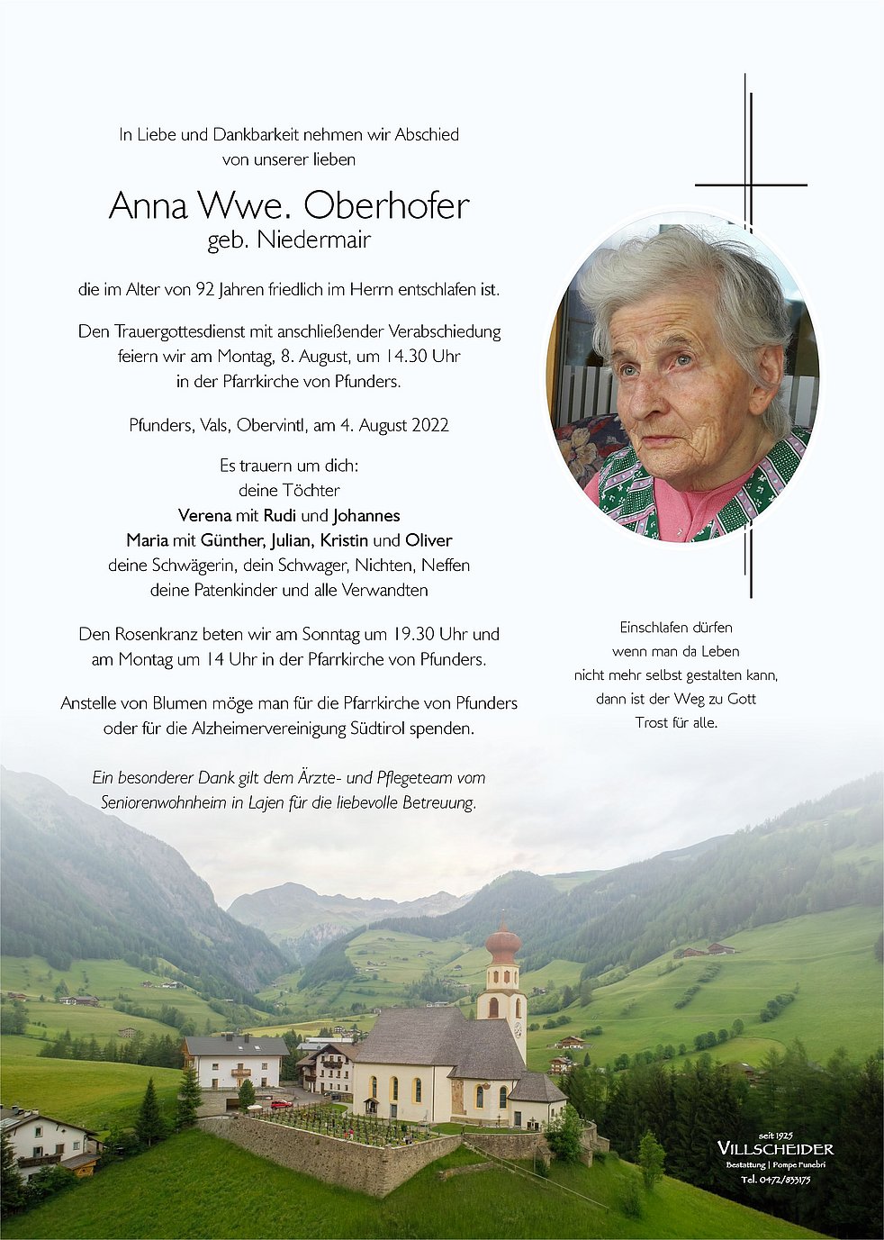 Begräbnisgottesdienst: 08.08. - 14:30 Uhr Pfunders