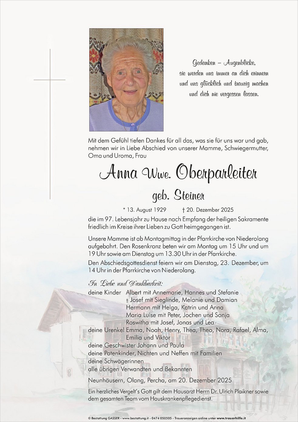 Unsere Mamme ist ab Montagmittag in der Pfarrkirche von Niederolang aufgebahrt. Den Rosenkranz beten wir am Montag um 15 Uhr und um 19 Uhr sowie am Dienstag um 13.30 Uhr in der Pfarrkirche.