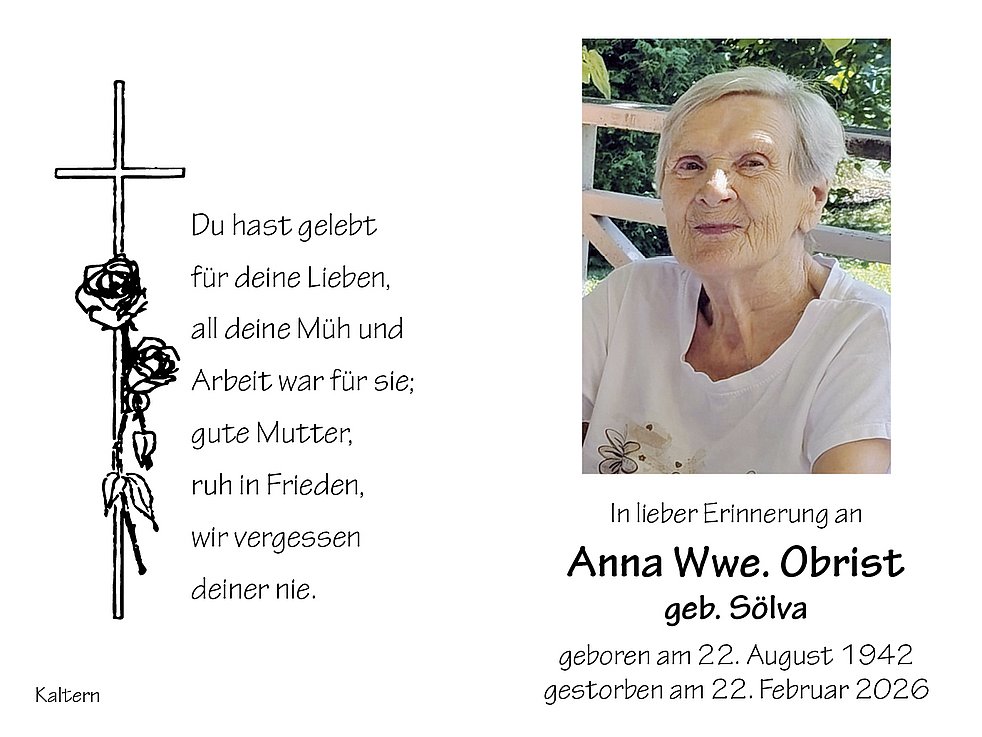 Den Trauergottesdienst mit anschließender Verabschiedung feiern wir am Donnerstag, dem 26. Februar um 14.30 Uhr in der Pfarrkirche von Kaltern.