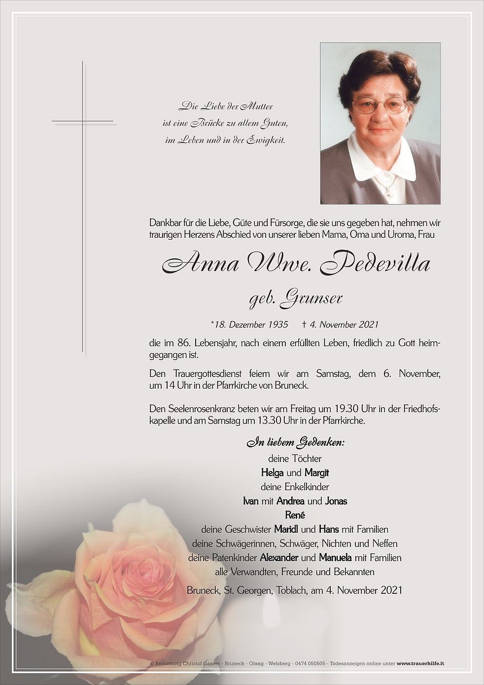 Den Trauergottesdienst feiern wir am Samstag, dem 6. November, um 14 Uhr in der Pfarrkirche von Bruneck.