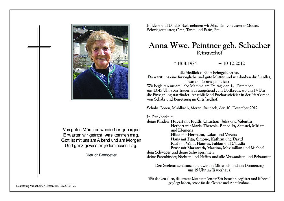 die Einsegnung stattfindet. Anschließend Eucharistiefeier in der Pfarrkirche von Schabs und Beisetzung im Ortsfriedhof.