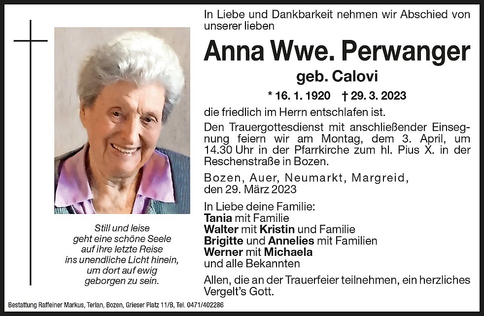 Den Trauergottesdienst mit anschließender Einsegnung feiern wir am Montag, dem 3. April, um 14.30 Uhr in der Pfarrkirche zum Hl. Pius X. in der Reschenstraße in Bozen.