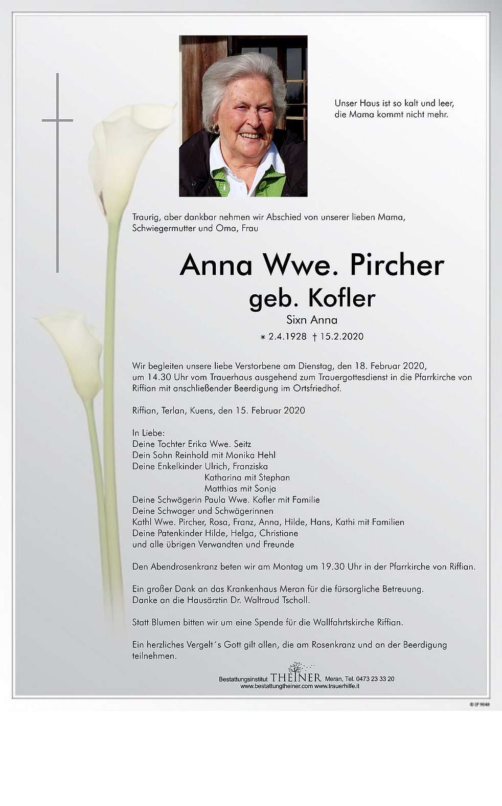 um 14.30 Uhr vom Trauerhaus ausgehend zum Trauergottesdienst in die Pfarrkirche von Riffian mit anschließender Beerdigung im Ortsfriedhof.