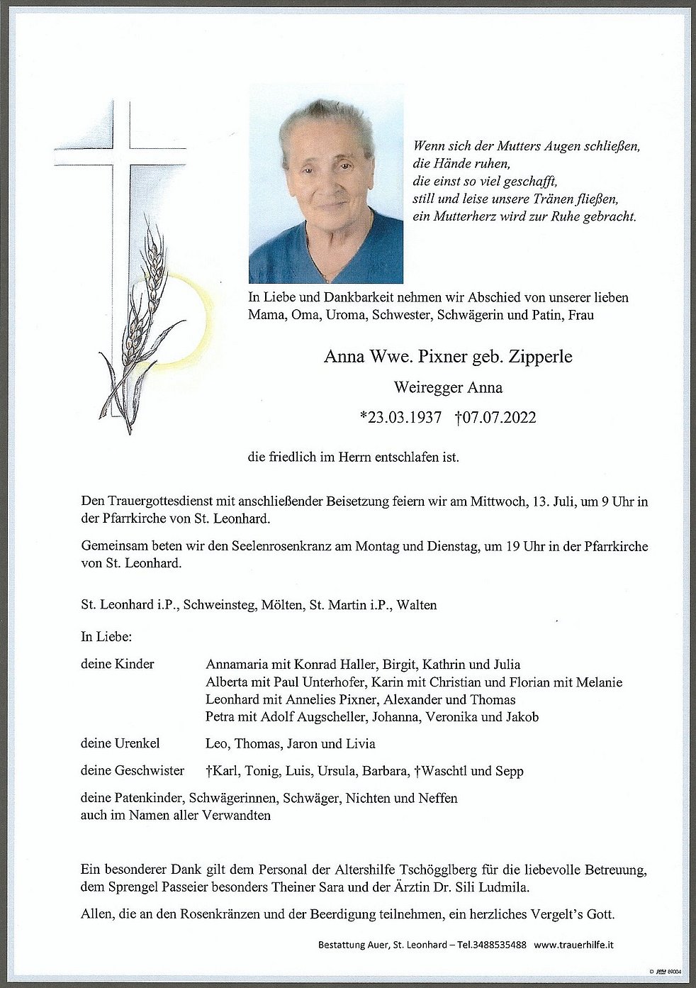 Ein besonderer Dank gilt dem Personal der Altershilfe Tschögglberg für die liebevolle Betreuung, dem Sprengel Passeier besonders Theiner Sara und der Ärztin Dr. Sili Ludmila.