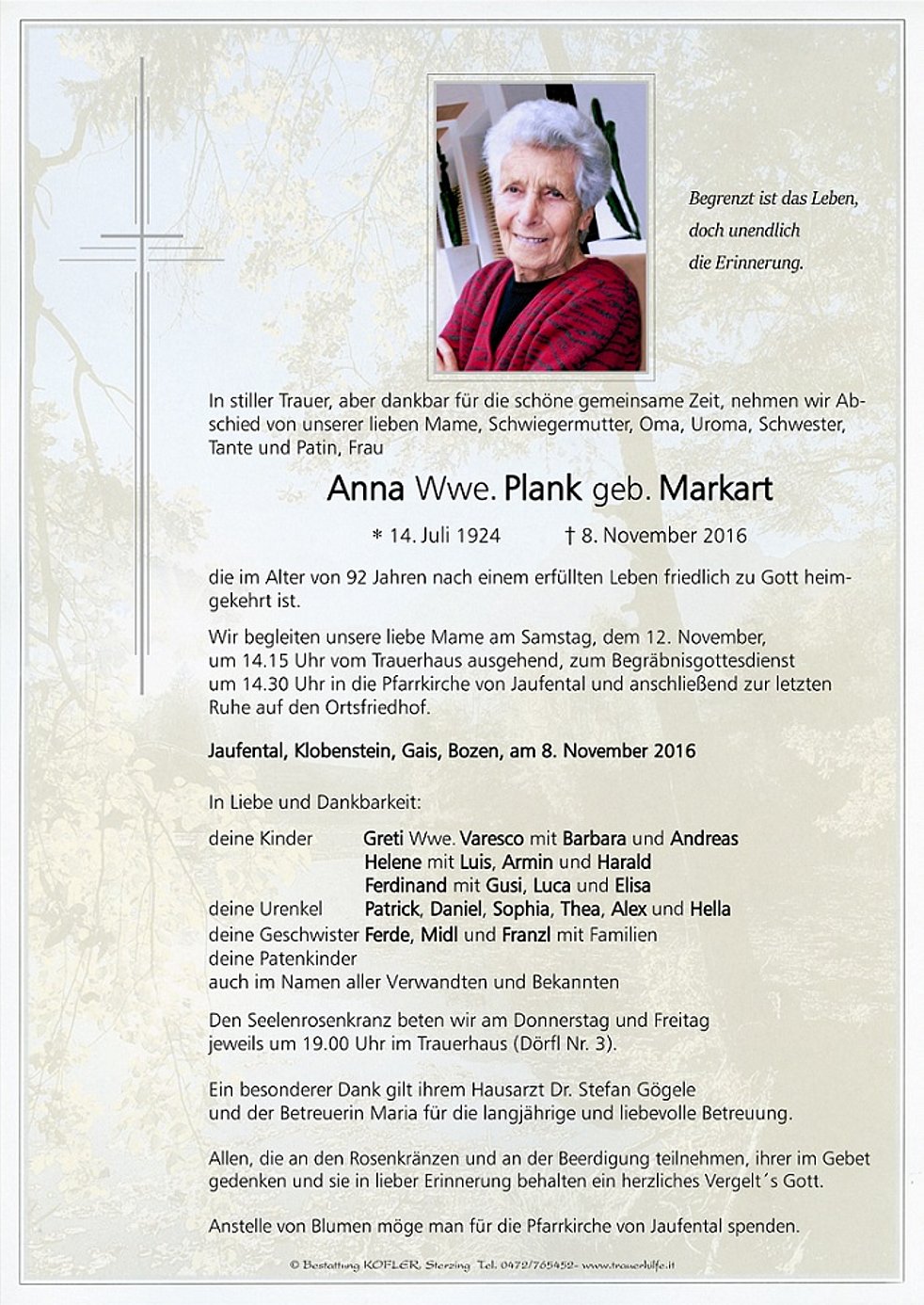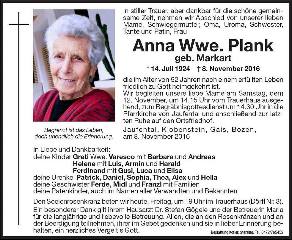 Wir begleiten unsere liebe Mame am Samstag, dem 12. November, um 14.15 Uhr vom Trauerhaus ausgehend, zum Begräbnisgottesdienst um 14.30 Uhr in die Pfarrkirche von Jaufental und anschließend zur letzten Ruhe auf den Ortsfriedhof.
