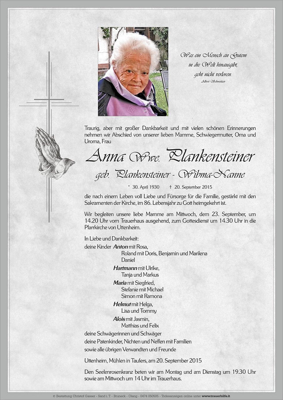die nach einem Leben voll Liebe und Fürsorge für die Familie, gestärkt mit den Sakramenten der Kirche, im 86. Lebensjahr zu Gott heimgekehrt ist.