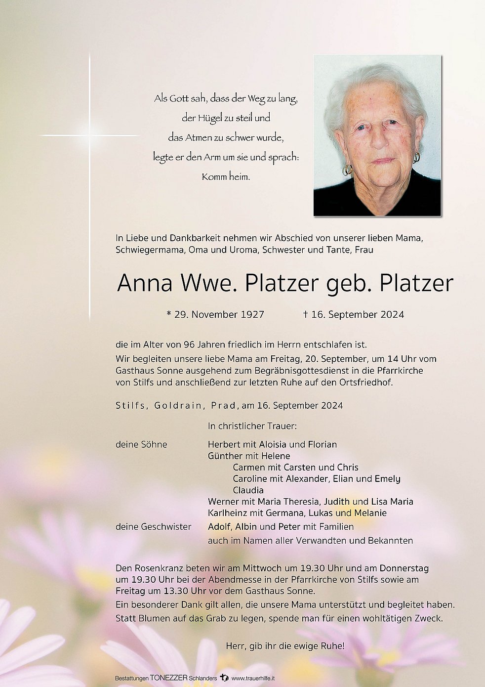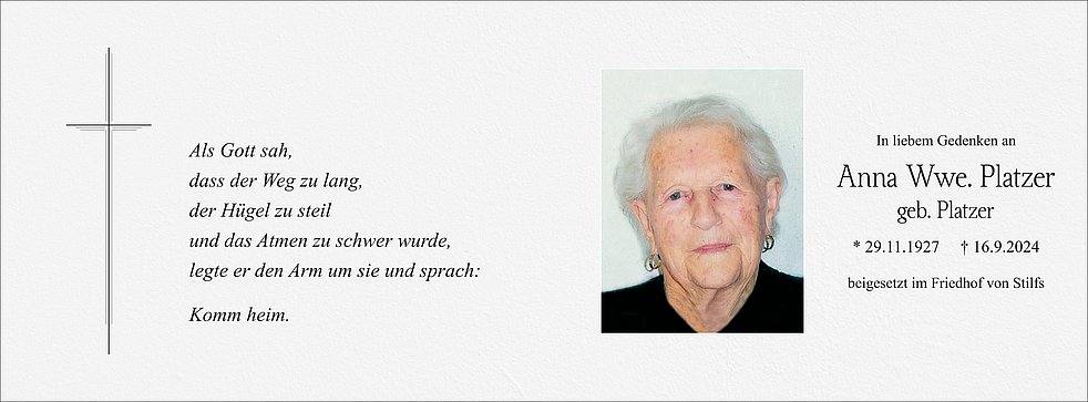 Wir begleiten unsere liebe Mama am Freitag, 20. September, um 14 Uhr vom Gasthaus Sonne ausgehend zum Begräbnisgottesdienst in die Pfarrkirche von Stilfs und anschließend zur letzten Ruhe auf den Ortsfriedhof.