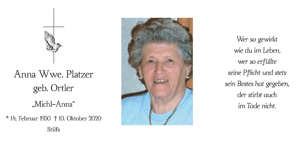 Den Begräbnisgottesdienst für unsere liebe Mama feiern wir am Mittwoch, 14. Oktober, um 14 Uhr in der Pfarrkirche von Stilfs. Anschließend erfolgt die Beisetzung im Ortsfriedhof.