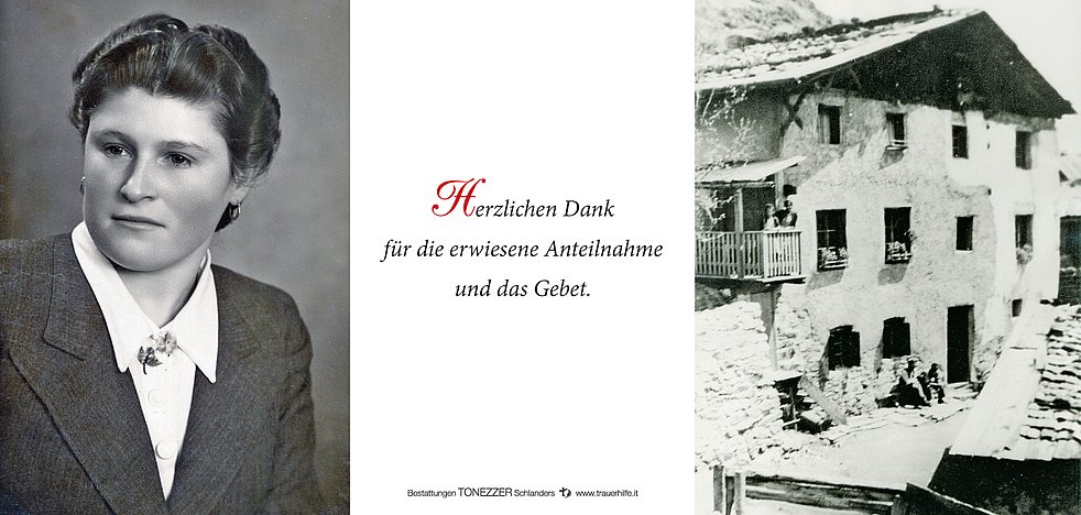 Ein besonderer Dank gilt unserer Hausärztin Frau Dr. Raffaela Stocker, dem gesamten Team vom Hauskrankenpflegedienst Sprengel Meran sowie dem Team vom Krankenhaus Meran für die liebevolle und fürsorgliche Betreuung.