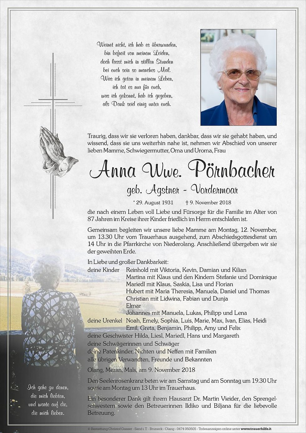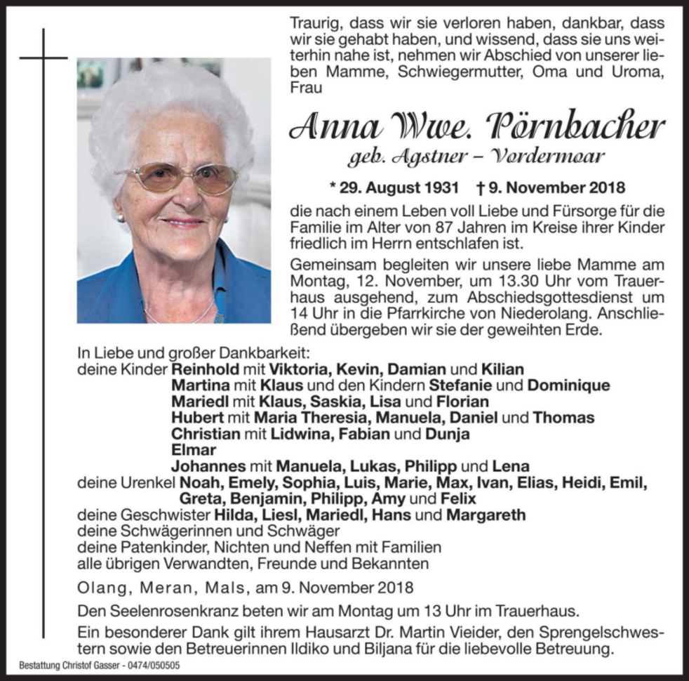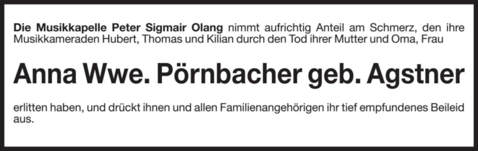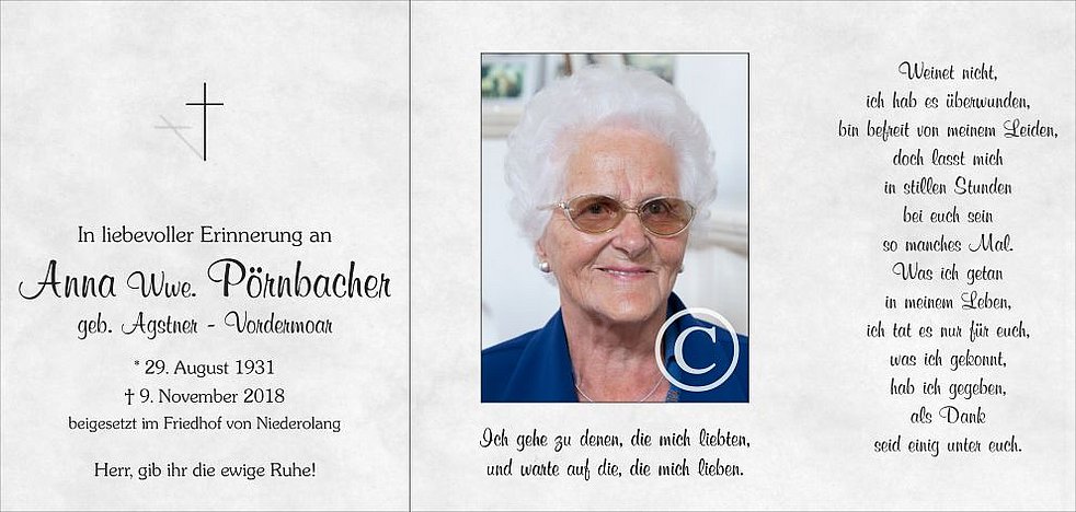 Gemeinsam begleiten wir unsere liebe Mamme am Montag, 12. November, um 13.30 Uhr vom Trauerhaus ausgehend, zum Abschiedsgottesdienst um 14 Uhr in die Pfarrkirche von Niederolang. Anschließend übergeben wir sie der geweihten Erde.