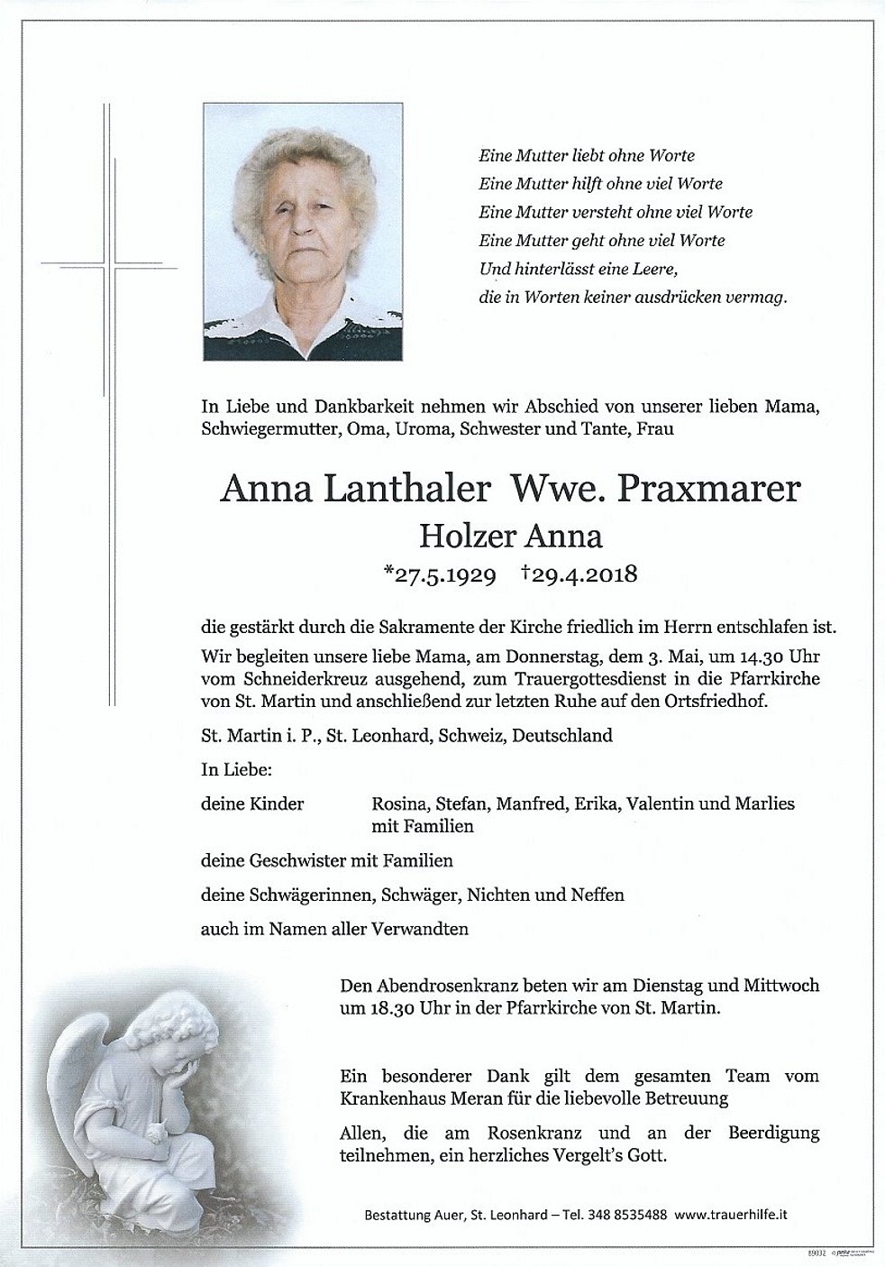 die gestärkt durch die Sakramente der Kirche friedlich im Herrn entschlafen ist. Wir begleiten unsere liebe Mama, am Donnerstag, dem 3. Mai, um 14.30 Uhr vom Schneiderkreuz ausgehend, zum Trauergottesdienst in die Pfarrkirche von St. Martin und anschließend zur letzten Ruhe auf den Ortsfriedhof.