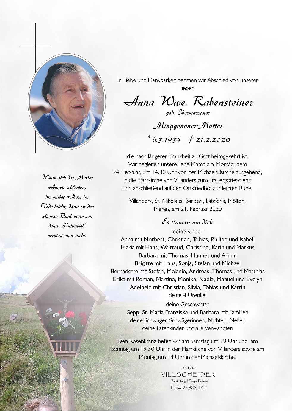 Begräbnisgottesdienst: 24.02. - 14:30 Uhr Villanders