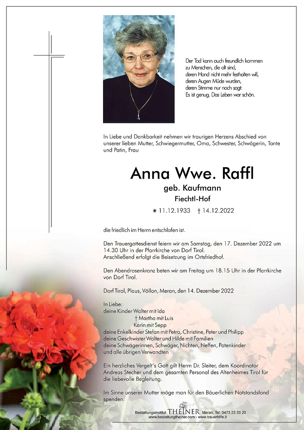 Den Trauergottesdienst feiern wir am Samstag, den 17. Dezember 2022 um 14.30 Uhr in der Pfarrkirche von Dorf Tirol.