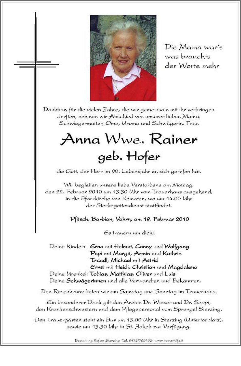 Dankbar, für die vielen Jahre, die wir gemeinsam mit ihr verbringen durften, nehmen wir Abschied von unserer lieben Mama, Schwiegermutter, Oma, Uroma und Schwägerin, Frau