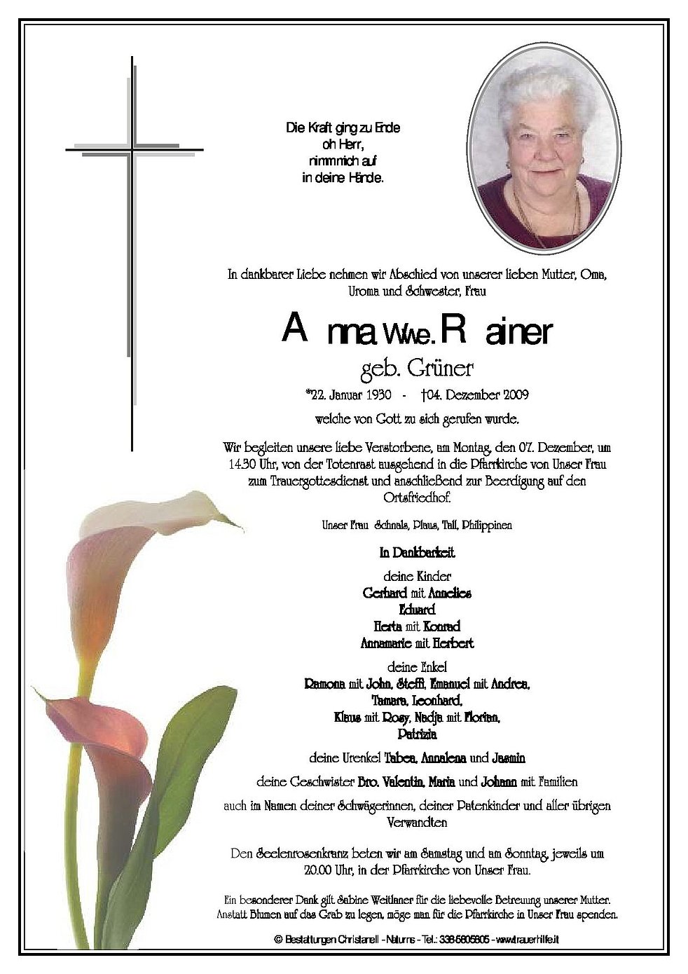 Wir begleiten unsere liebe Verstorbene, am Montag, den 07. Dezember, um 14.30 Uhr, von der Totenrast ausgehend in die Pfarrkirche von Unser Frau zum Trauergottesdienst und anschließend zur Beerdigung auf den Ortsfriedhof.