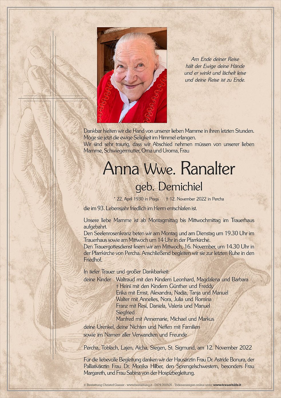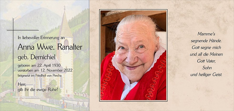 Den Trauergottesdienst feiern wir am Mittwoch, 16. November, um 14.30 Uhr in der Pfarrkirche von Percha. Anschließend begleiten wir sie zur letzten Ruhe in den Friedhof.