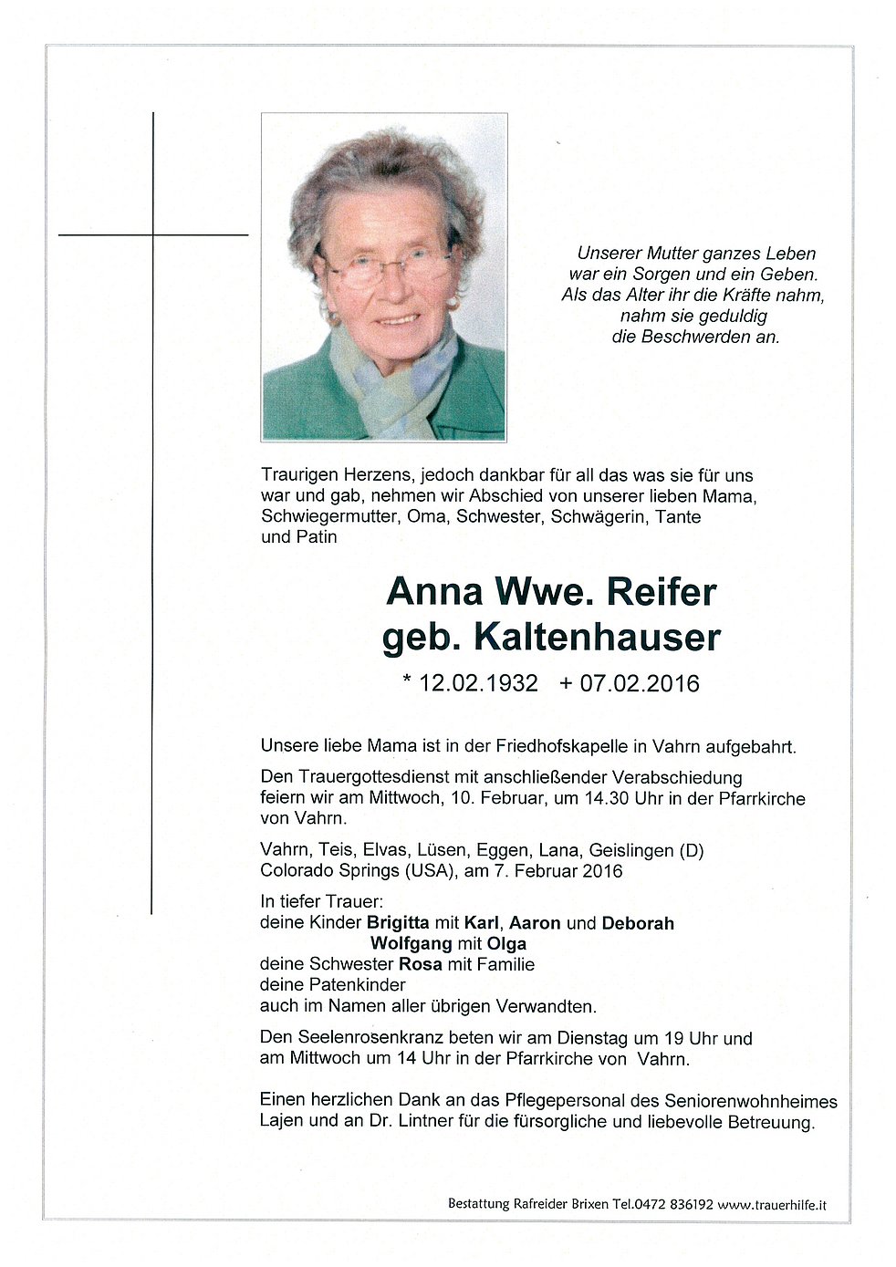 Einen herzlichen Dank an das Pflegepersonal des Seniorenwohnheimes Lajen und an Dr. Lintner für die fürsorgliche und liebevolle Betreuung.