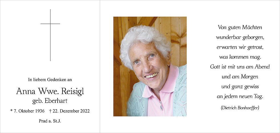 Am Dienstag, 27. Dezember, um 13.30 Uhr beten wir den Rosenkranz; um 14 Uhr feiern wir den Begräbnisgottesdienst in der Pfarrkirche von Prad und anschließend begleiten wir unsere liebe Mama zur letzten Ruhe auf den Ortsfriedhof von Prad.