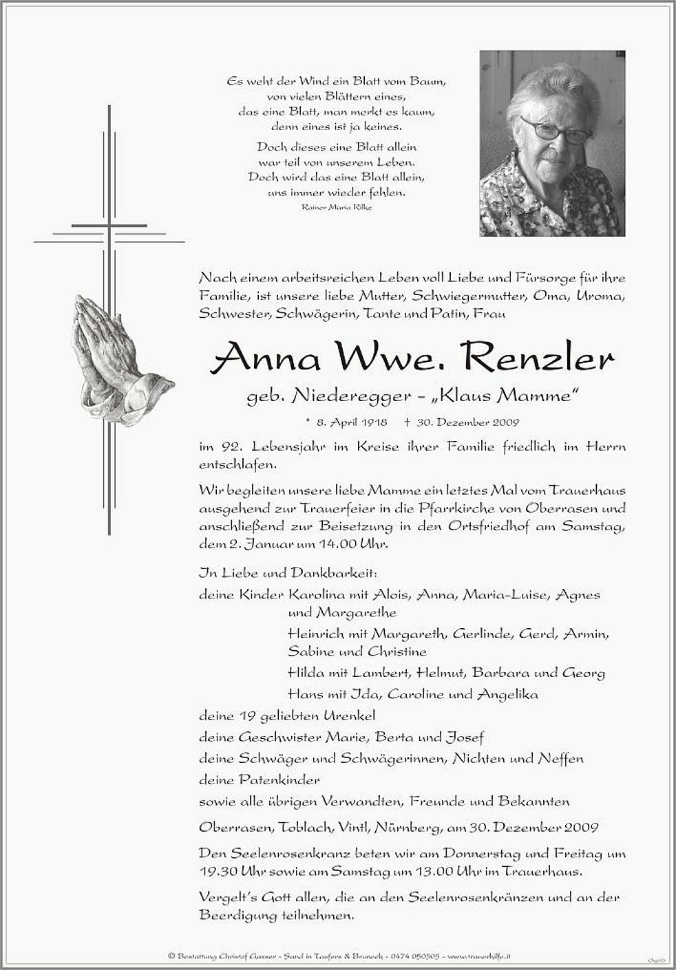 Wir begleiten unsere liebe Mamme ein letztes Mal vom Trauerhaus ausgehend zur Trauerfeier in die Pfarrkirche von Oberrasen und anschließend zur Beisetzung in den Ortsfriedhof am Samstag, dem 2. Januar um 14.00 Uhr.