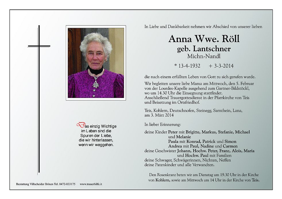 von Kohlern, sowie am Mittwoch um 14 Uhr in der Kirche von Teis.