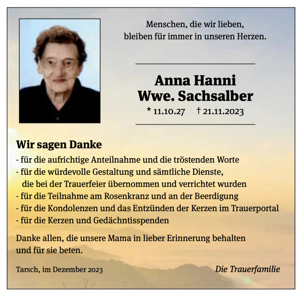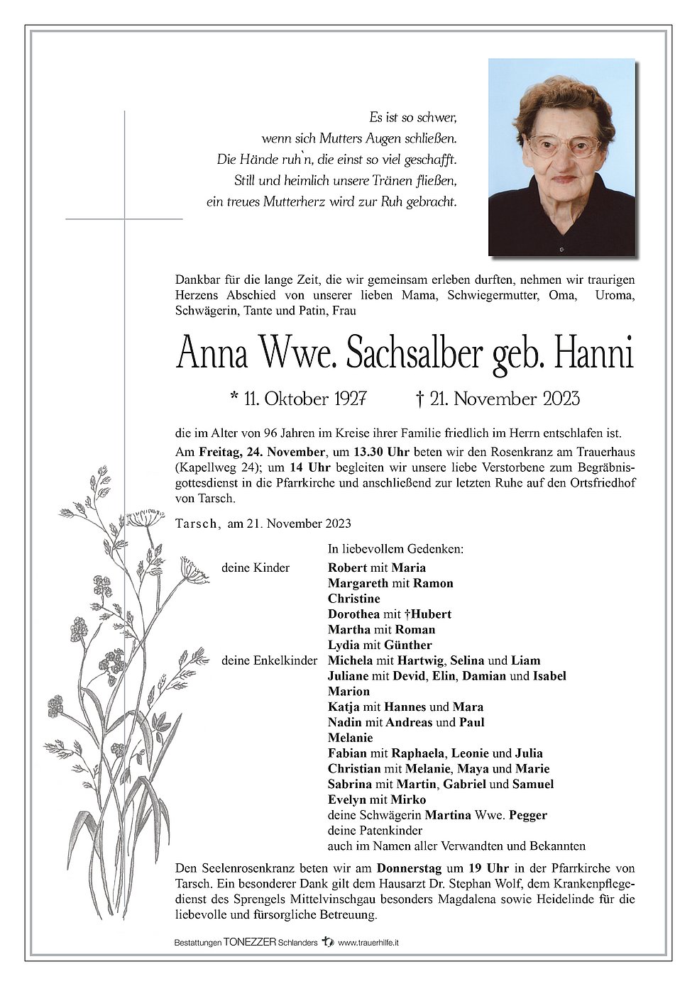 Am Freitag, 24. November, um 13.30 Uhr beten wir den Rosenkranz am Trauerhaus (Kapellweg 24); um 14 Uhr begleiten wir unsere liebe Verstorbene zum Begräbnisgottesdienst in die Pfarrkirche und anschließend zur letzten Ruhe auf den Ortsfriedhof von Tarsch.